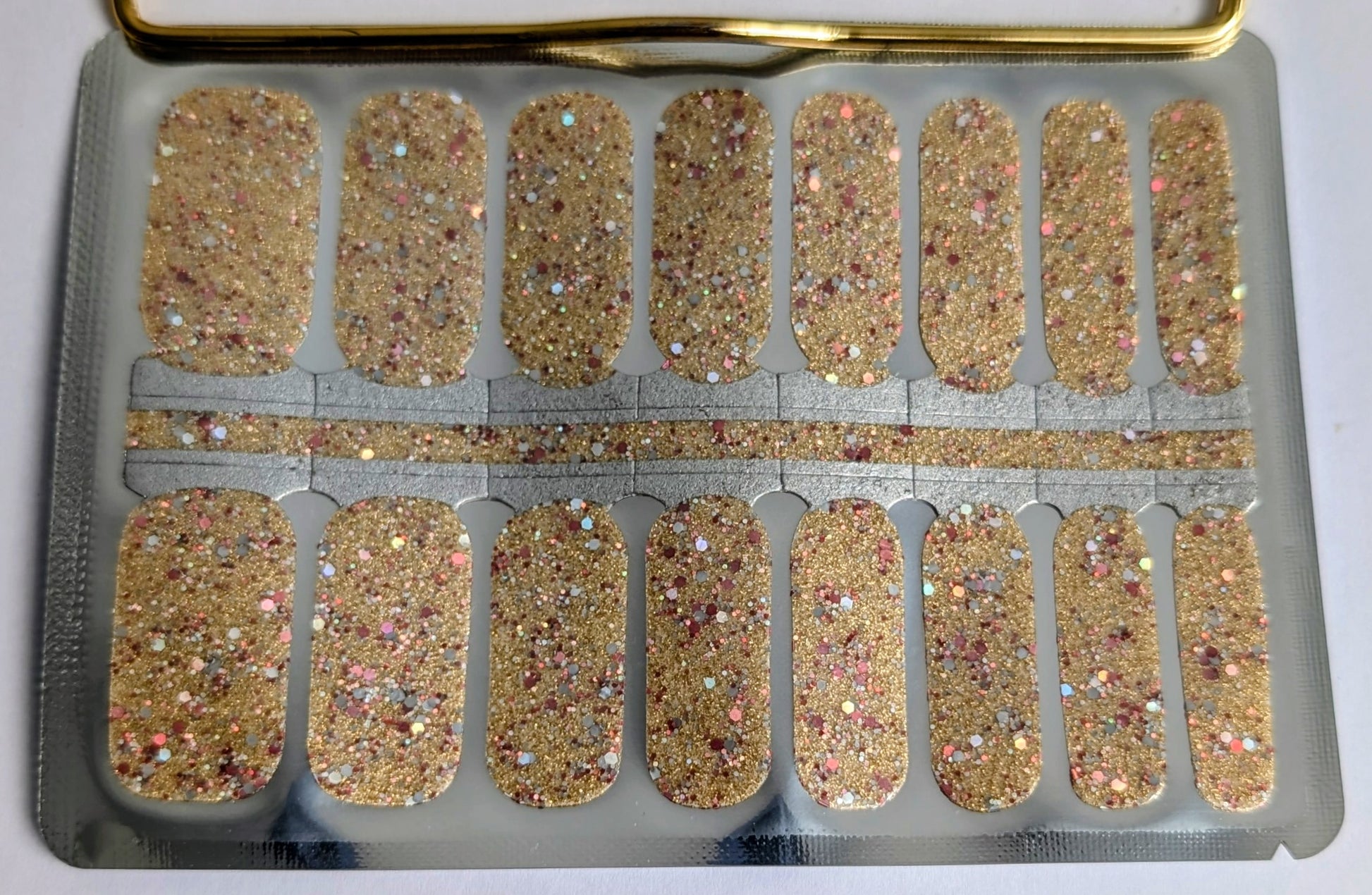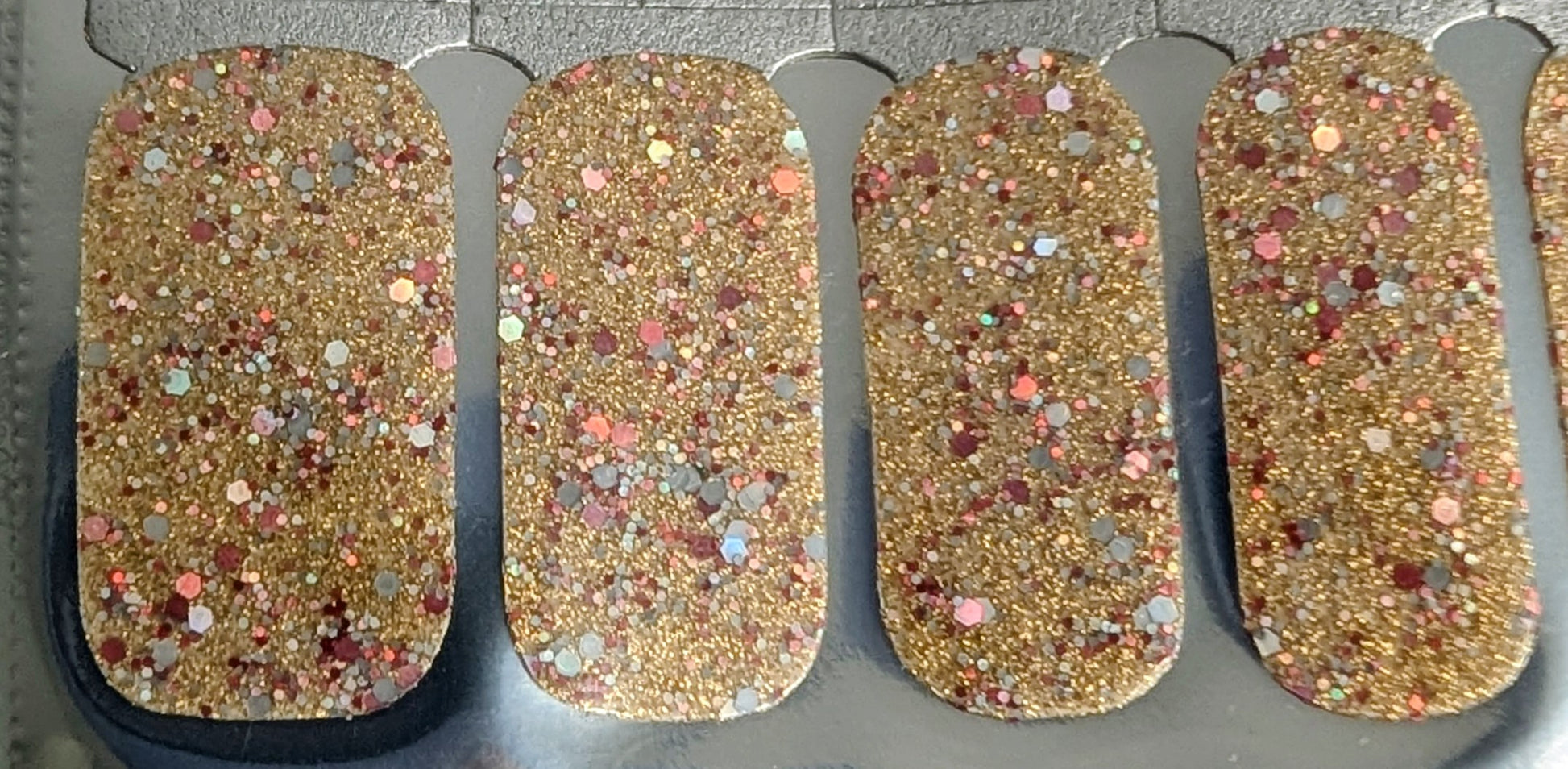 Extra Certifié, c’est tout sauf discret. Et c’est exactement le but. Ce jeu de vernis autocollants dorés ultra scintillants mélange une base dorée chaleureuse à de gros éclats multicolores qui captent la lumière à chaque mouvement. Le résultat : une manucure audacieuse, festive et assumée.