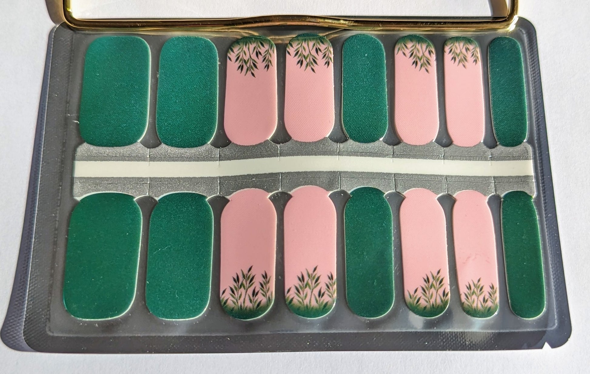Apportez une touche naturelle et élégante à vos ongles avec le modèle de vernis autocollant Feuillage Chic. Ces vernis autocollants brillants associent un vert foncé raffiné et un rose pastel délicat, sublimés par de fins motifs feuillus. Un design frais et féminin qui s’adapte à toutes les occasions.