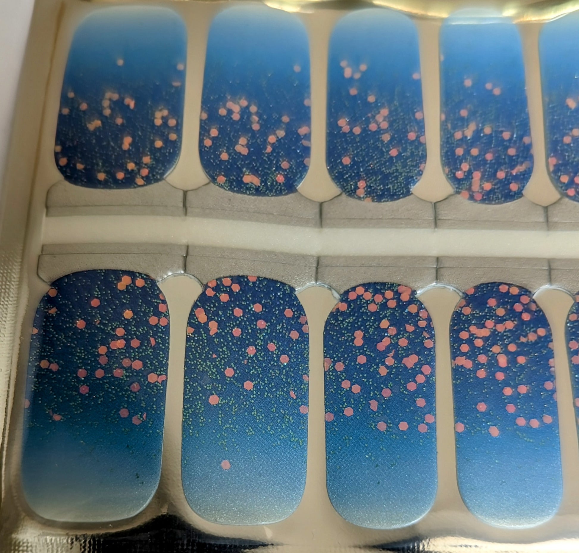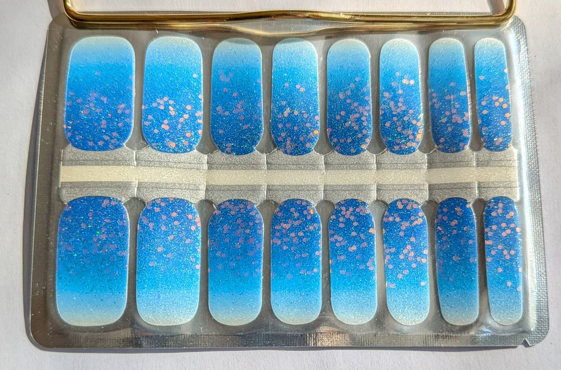 Get ready to shine with our Arctic Glow nail wraps. These glossy nail wraps feature an elegant blue to white ombré and sprinkles of big glitters that add a touch of subtle elegance to your look. Perfect for any occasion, these wraps will make you feel glamorous in no time!