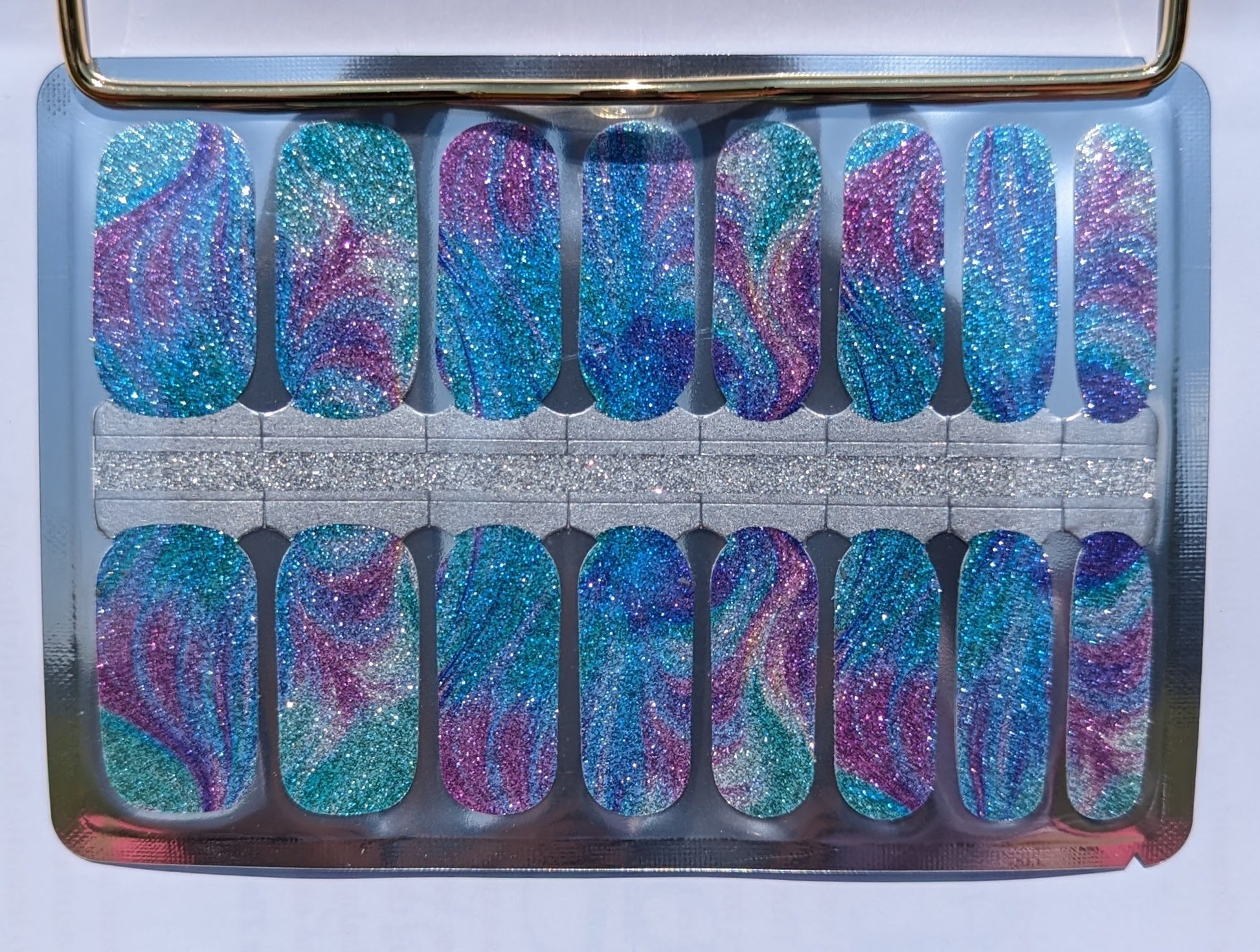 Get ready to shine with our Aurora Borealis nail wraps. These sparkly and glittery nail wraps feature a pretty combo of light green, purple, and blue glitters that remind you of the Northern Lights and add a touch of elegance to your look. Perfect for any occasion, these wraps will have you feeling glamorous within minutes!