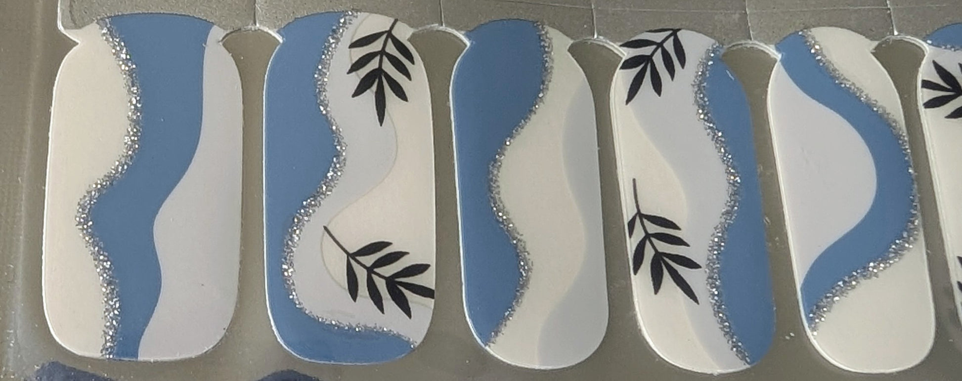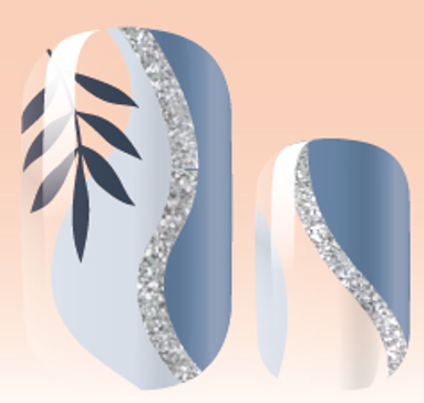 Inspired by delicate botanicals and calm winter hues, Blue Willow blends soft blues, silvery accents, and minimalist leaf details for an effortlessly modern look. This glossy nail wrap set features transparent white sections framed by subtle silver sparkle lines, creating a layered, fluid design that feels both fresh and refined.