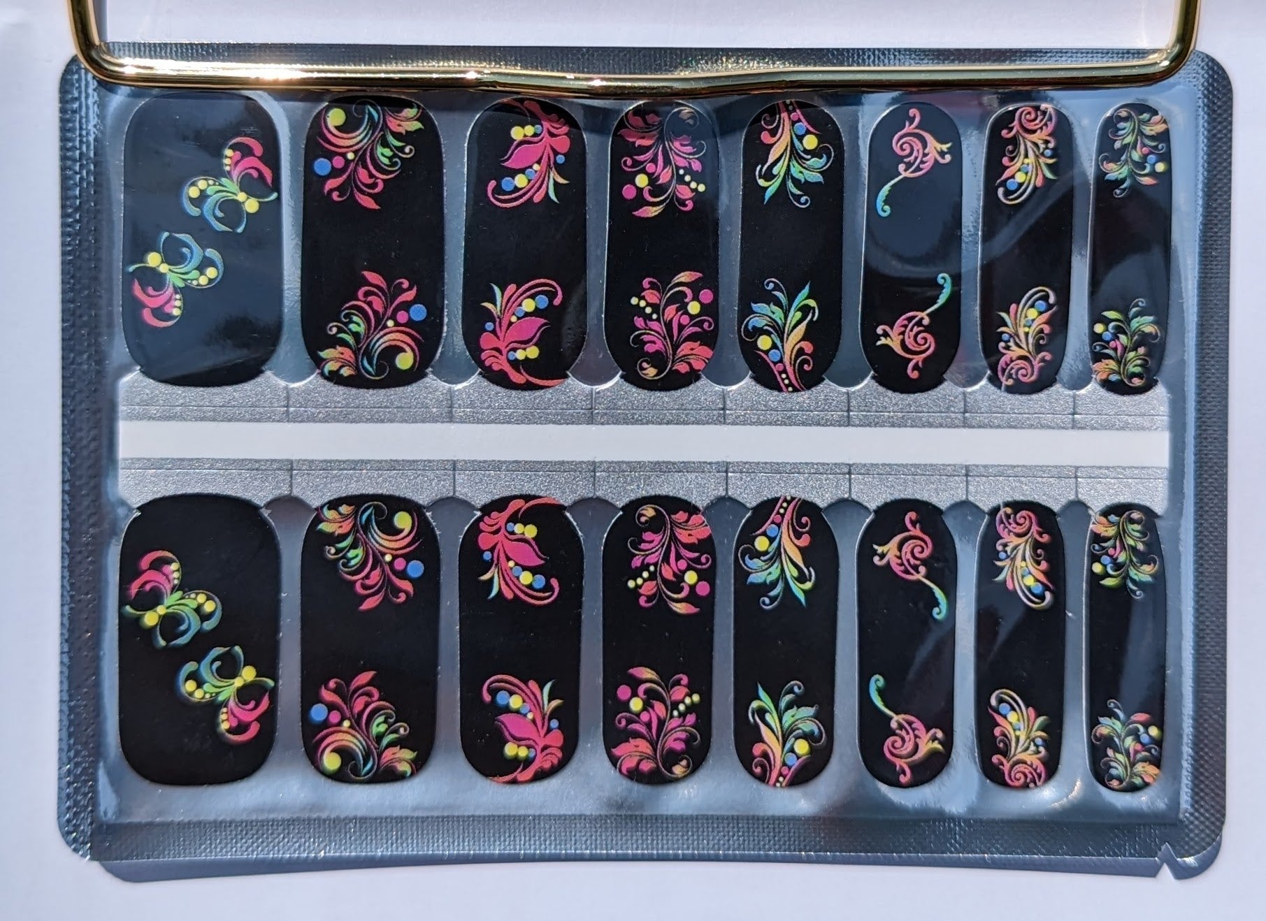 Get ready to shine with our Botanical Beauty nail wraps. These sleek nail wraps feature an elegant black shade in a glossy finish with pink and green flowers that add a touch of colorful elegance to your look. Perfect for any occasion, these wraps will have you feeling glamorous in no time!