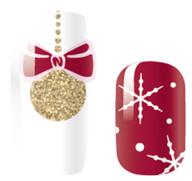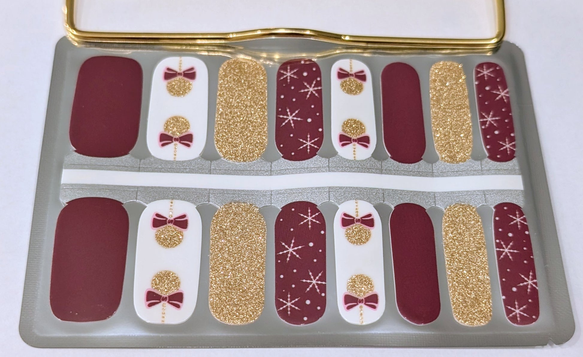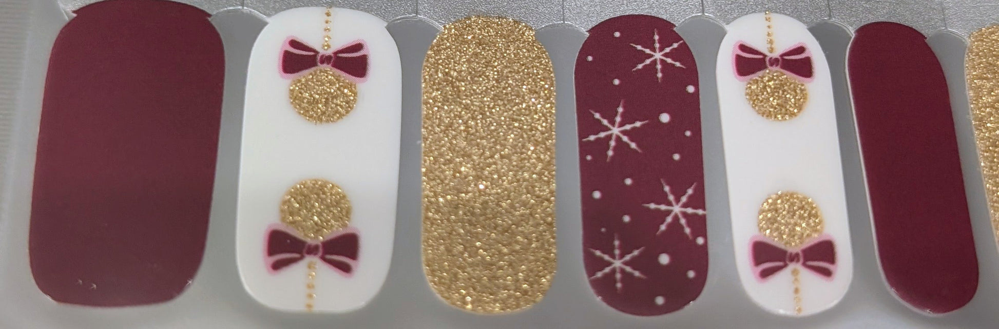 Classic red, radiant gold, and a touch of holiday charm, Bow & Beyond is made for the festive season. This glossy and glittery nail wrap set pairs deep red shine with sparkling gold accents and delicate white ornament nails with glossy glitter details.