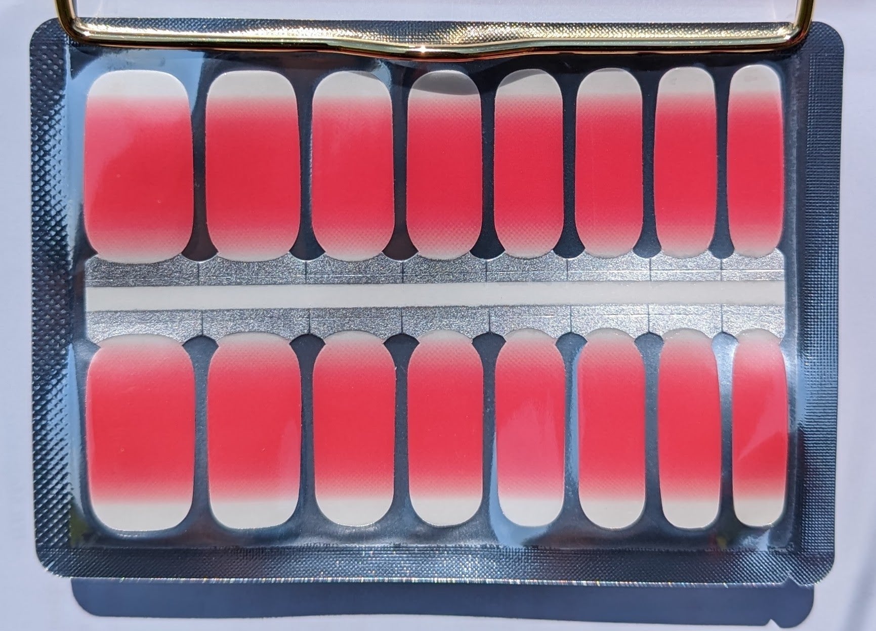 Get ready to shine with our Crimson Kiss nail wraps. These glossy nail wraps feature a pretty valentine red to white ombré that adds a touch of bold elegance to your look. Perfect for any occasion, these wraps will have you feeling glamorous in no time!