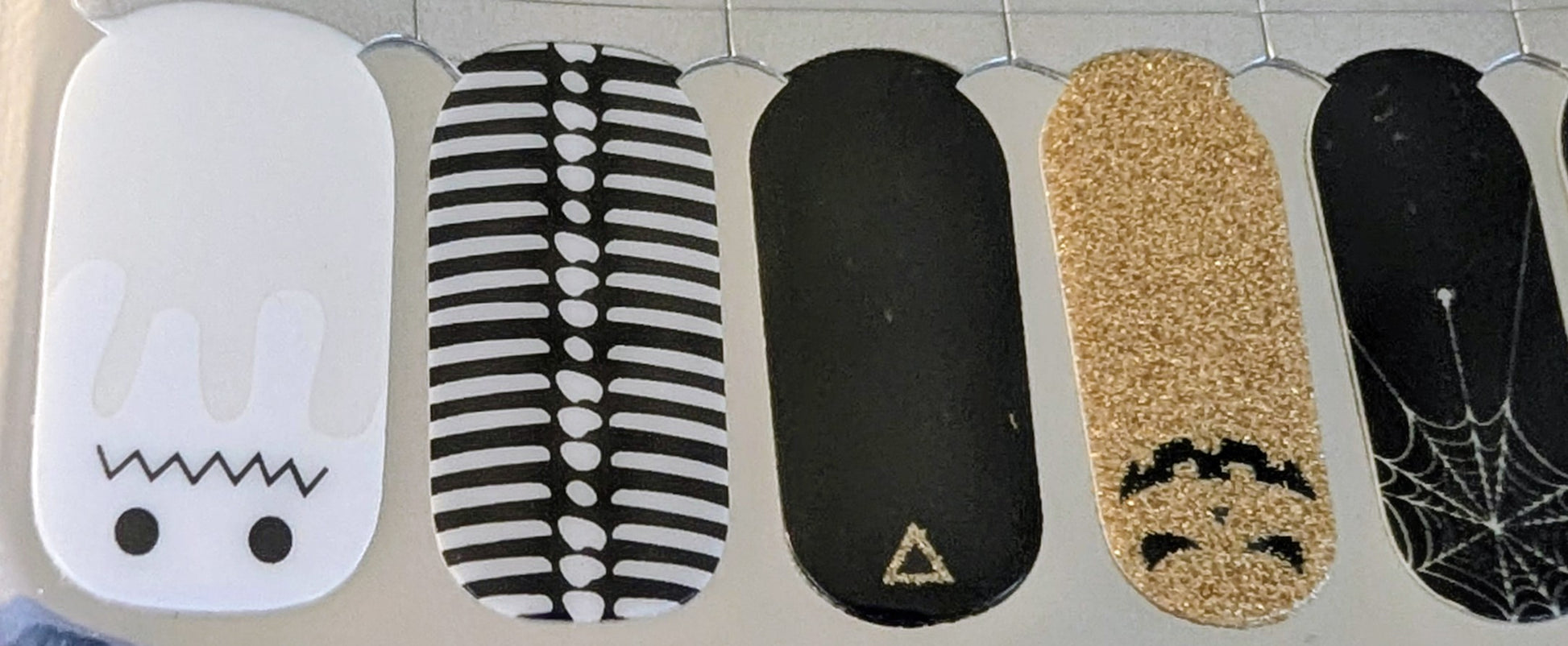 Mysterious, glossy, and perfectly dramatic. Dark Allure combines black and transparent tones with gold glitter details, featuring subtle Halloween-inspired accents like webs, bones, and spooky motifs. The result is a polished, moody design that’s equal parts elegant and playful, ideal for fall nights, Halloween parties, or anytime you’re feeling bold.
