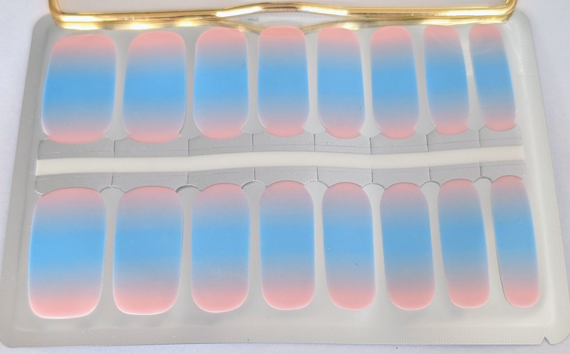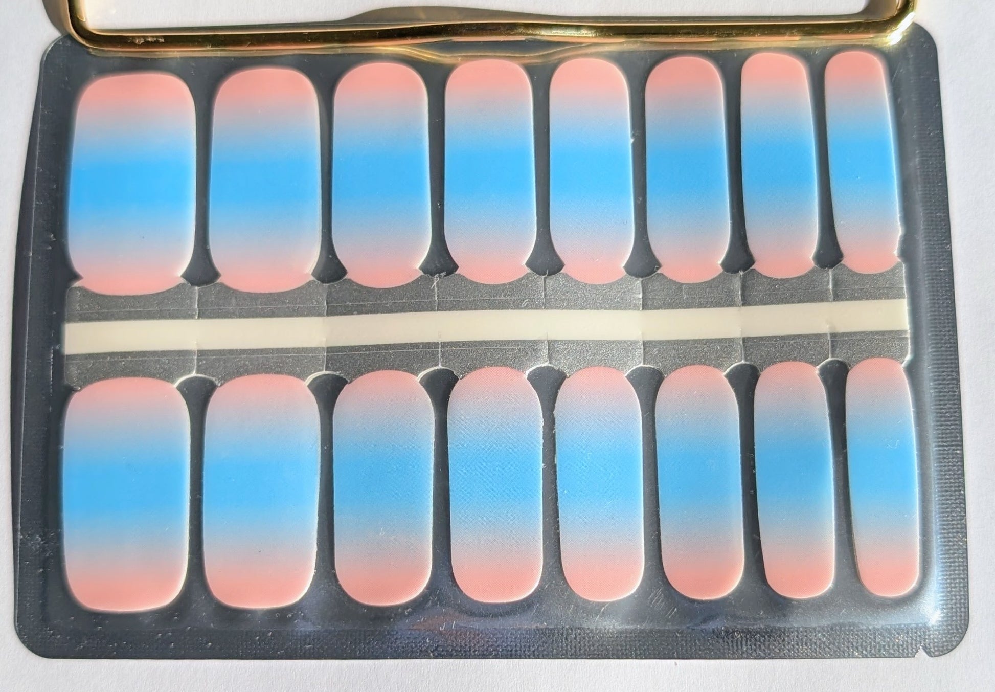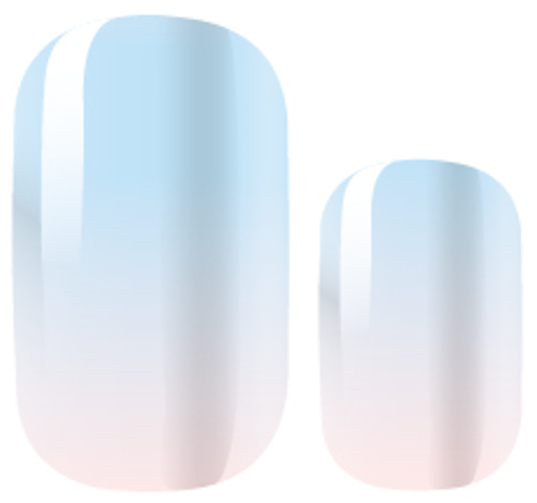 Fade Into You is a glossy ombré nail wrap set that blends soft sky blue into a delicate blush pink, creating a smooth, seamless transition that feels calm and intentional.