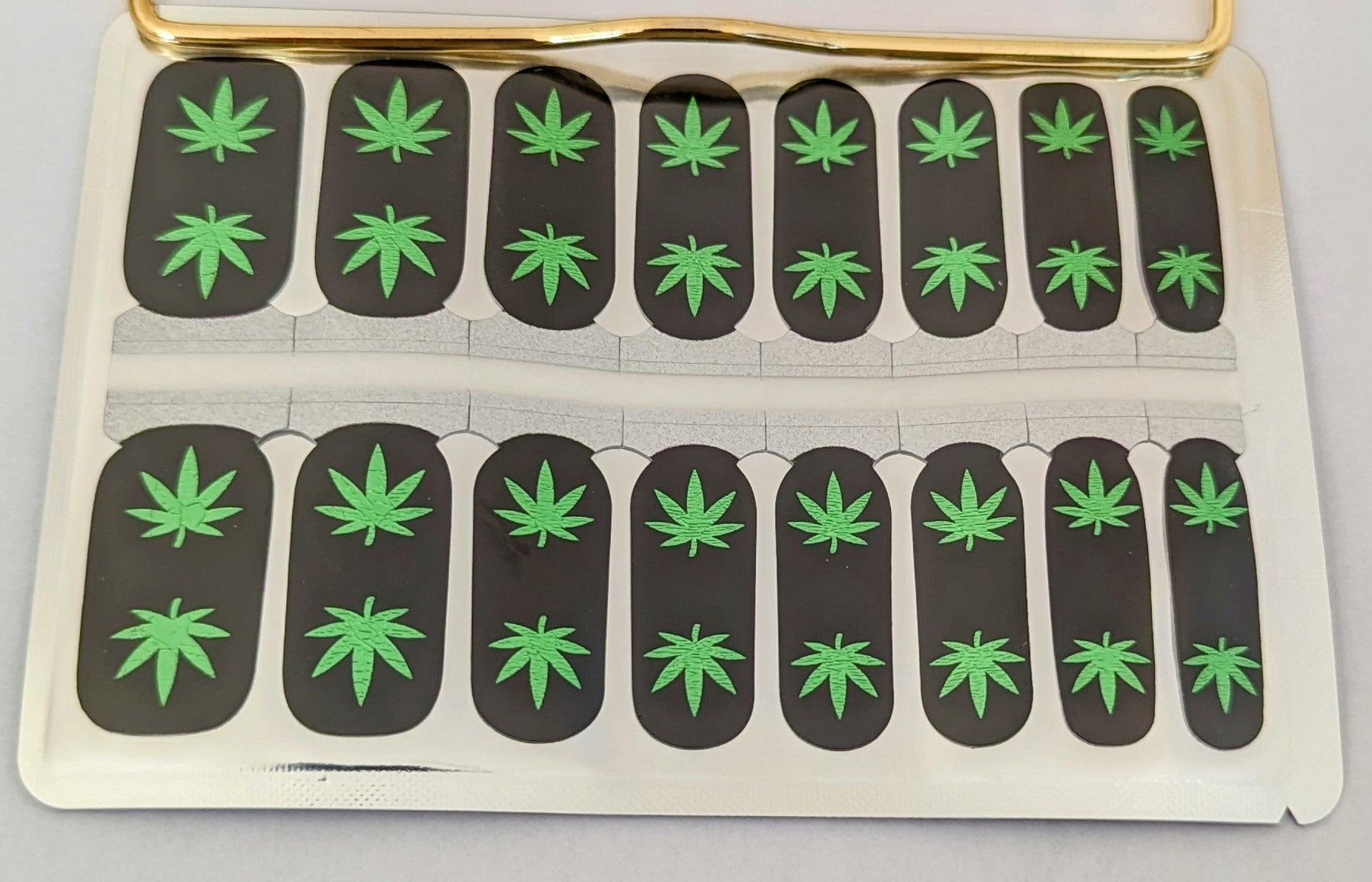 Get ready to shine with our Four Twenty Essence nail wraps. These glossy nail wraps feature a solid black color with metallic cannabis leaves that add a touch of fun to your look. Perfect for any occasion, these wraps will have you feeling playful in no time!