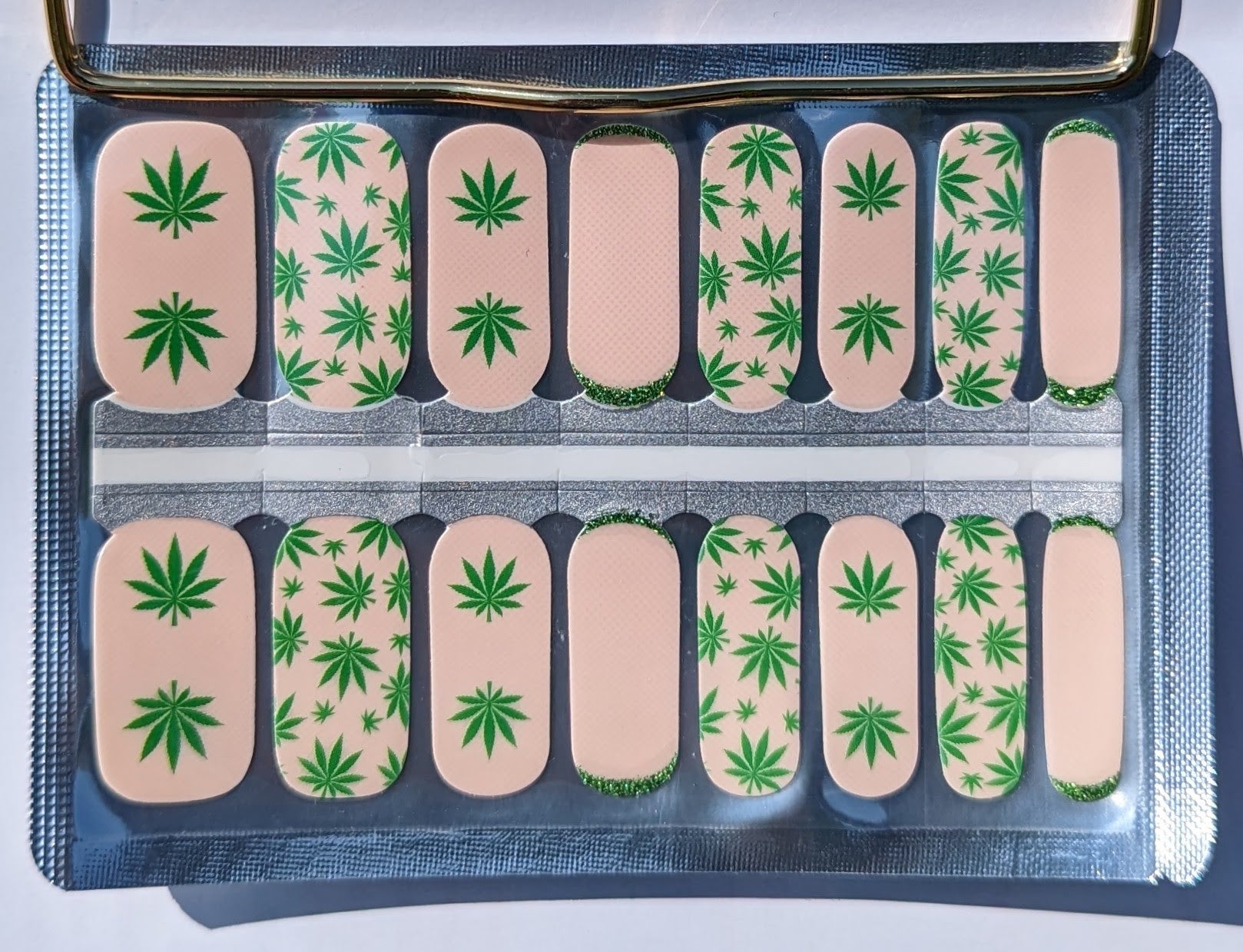 Get ready to shine with our Ganja Glam nail wraps. These glossy nail wraps feature a subtle antique white shade with a cannabis leaves pattern that adds a touch of fun to your look. Perfect for any occasion, these wraps will have you feeling playful in no time!