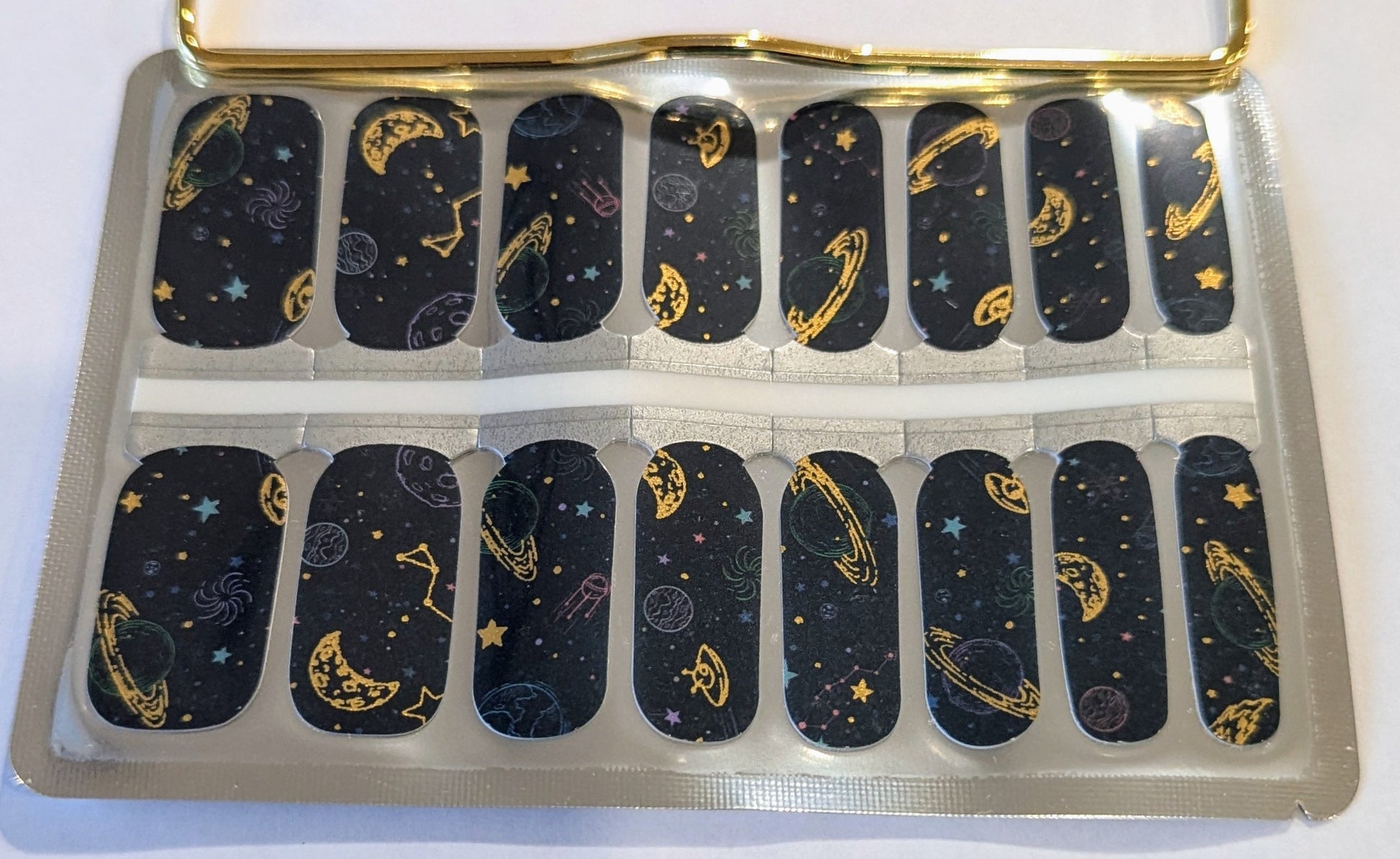 Get ready to shine with our Gilded Night nail wraps. These glossy black/dark blue nail wraps feature metallic gold galaxy-themed patterns that add a touch of mystic elegance to your look. Perfect for any occasion, especially during the Holiday season, these wraps will make you feel glamorous in no time!