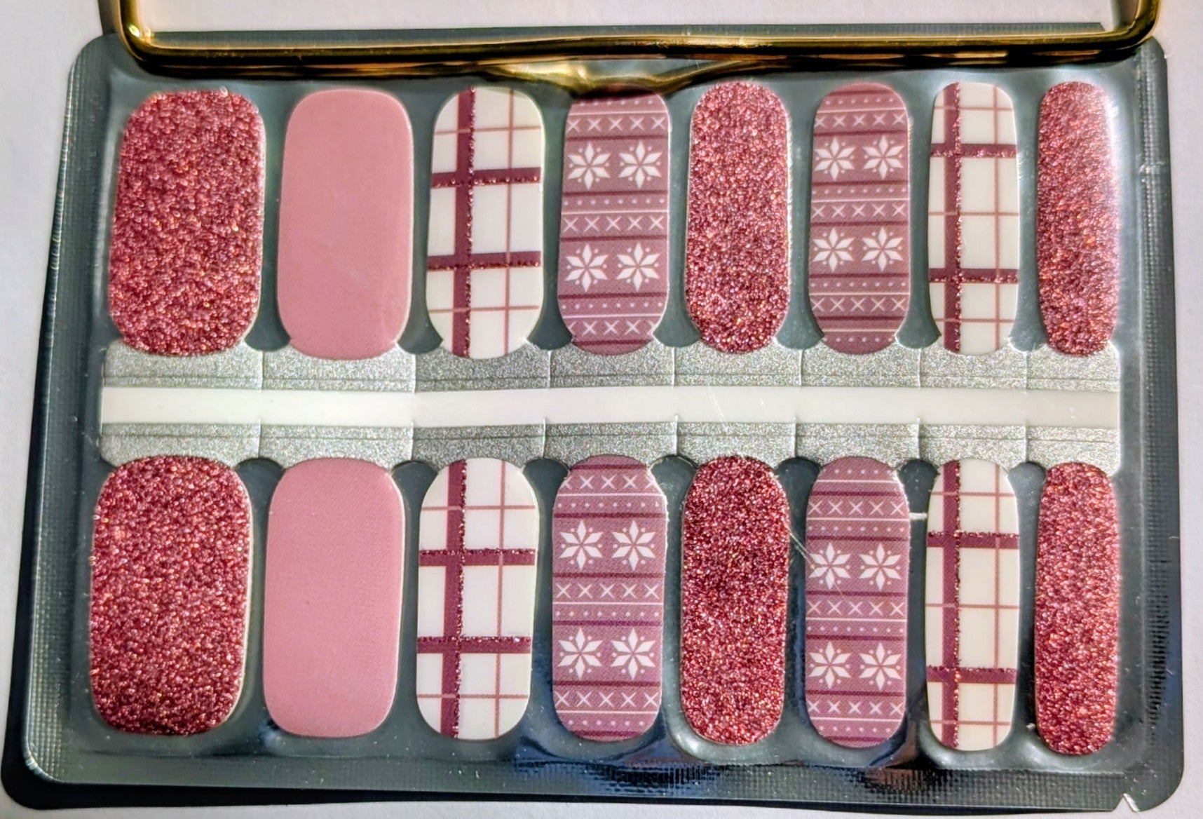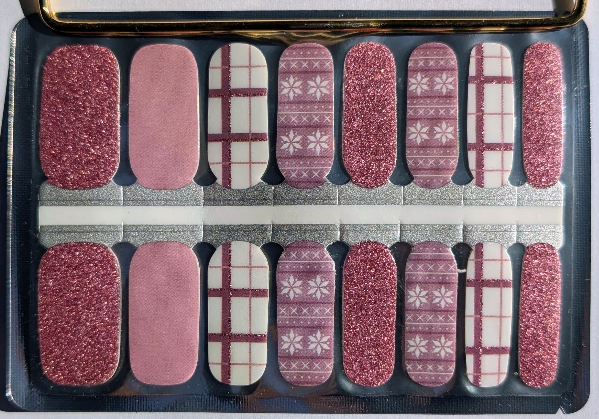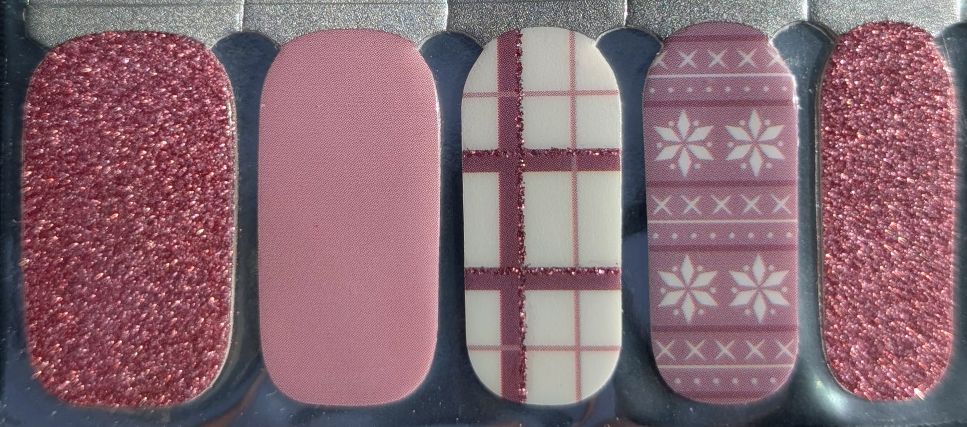 Glam, But Grounded is where sparkle meets balance. This glossy nail wrap set blends soft pink and mauve tones with subtle glitter accents and cozy patterned details for a look that feels polished without trying too hard.