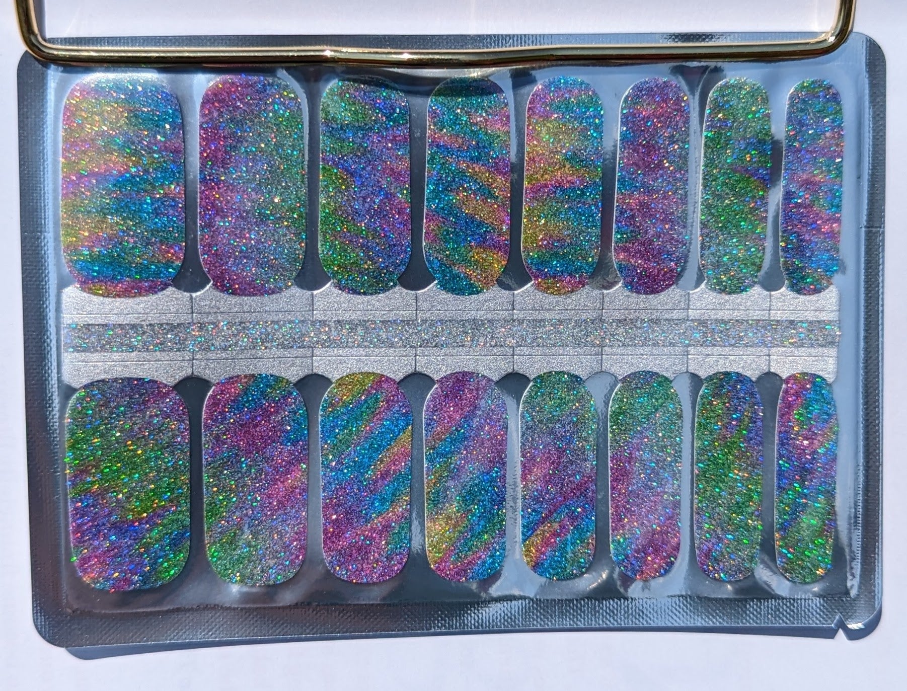 Get ready to shine with our Glistening Garden nail wraps. These sparkly and glittery nail wraps feature a pretty combo of summer green, purple, blue, and yellow sparkles that add a touch of elegance to your look. Perfect for any occasion, these wraps will have you feeling glamorous in no time!