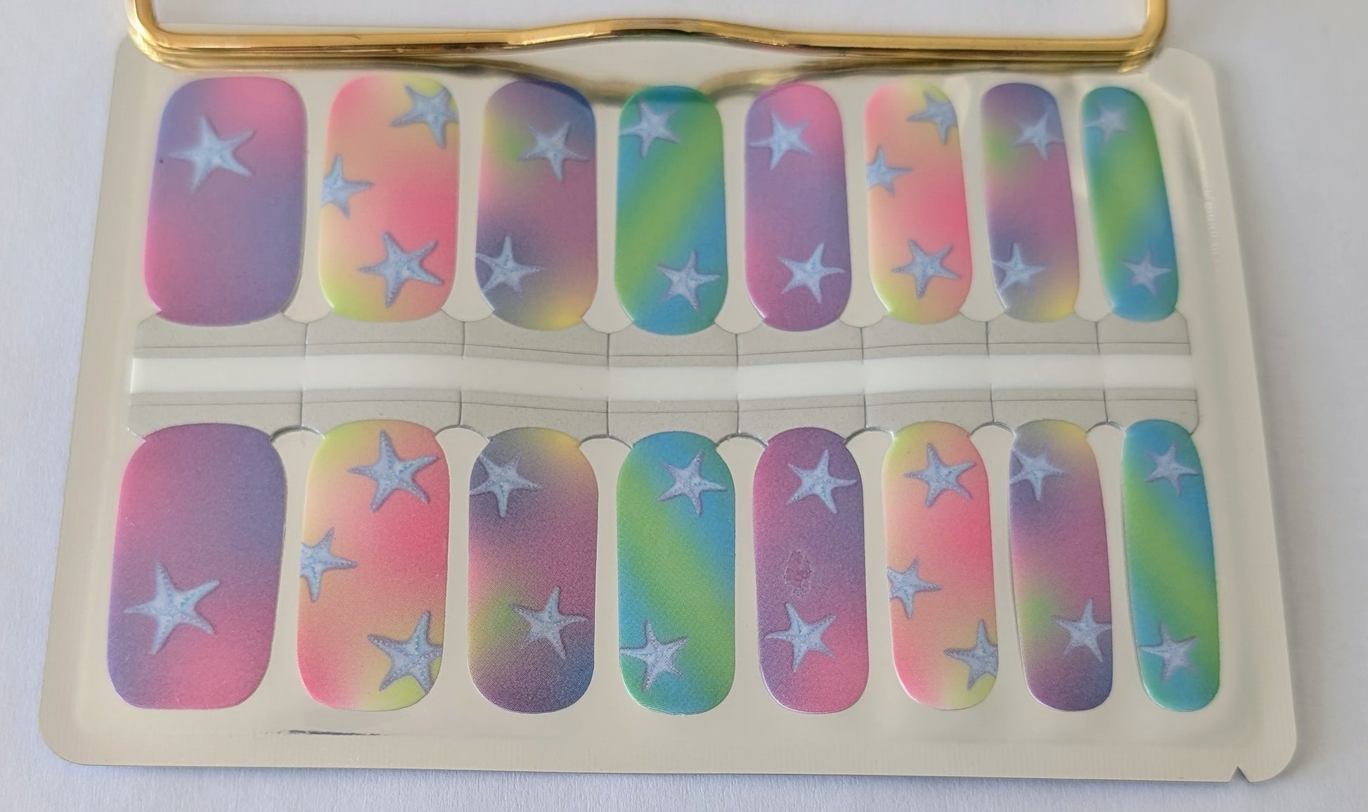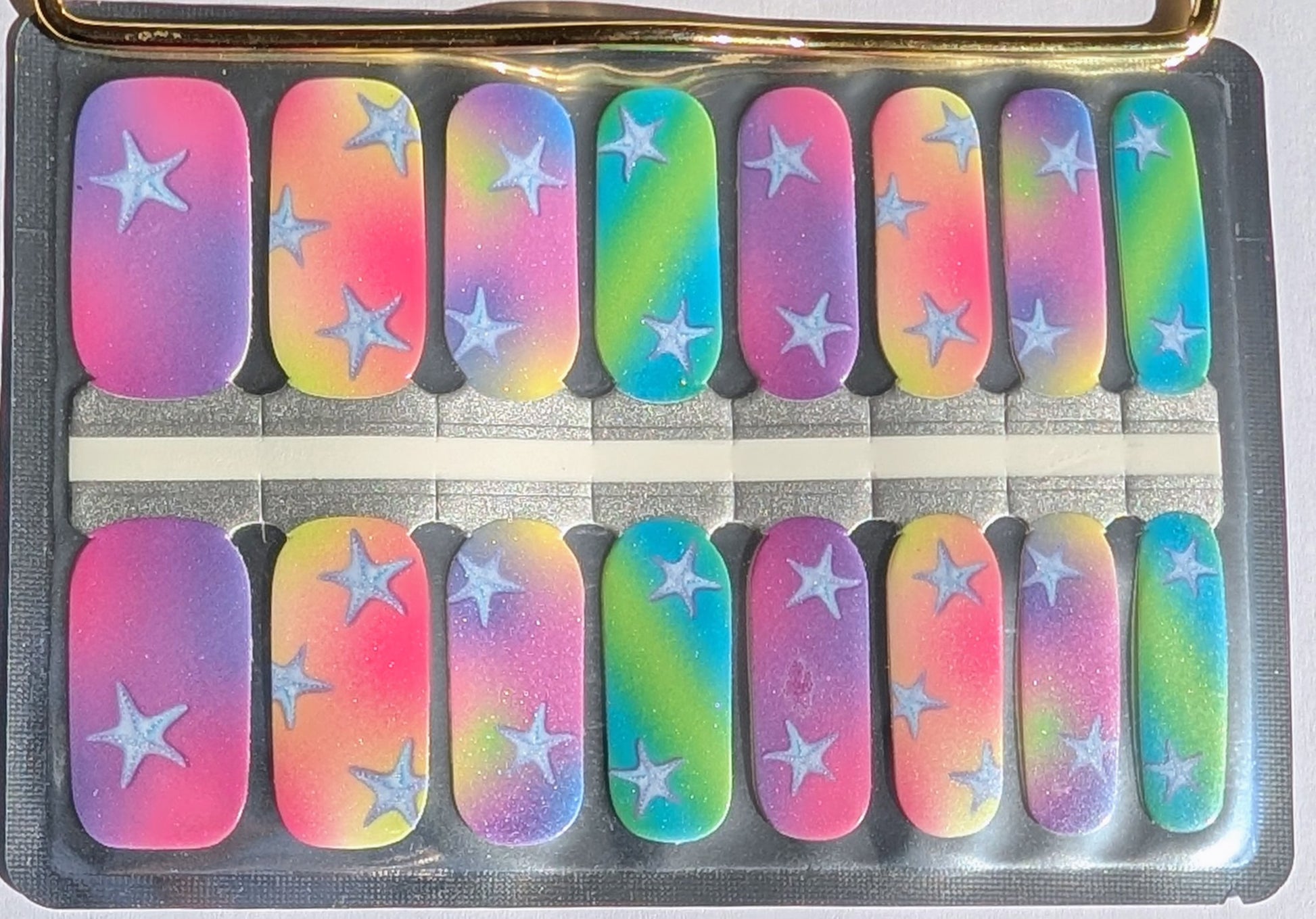 Glow Getter is for the ones who radiate without trying. This pearlescent design blends soft rainbow ombré tones with delicate star accents for a finish that feels dreamy yet confident. The shimmer catches the light subtly, giving you that glow-from-within effect without looking overdone. It’s playful. It’s polished.