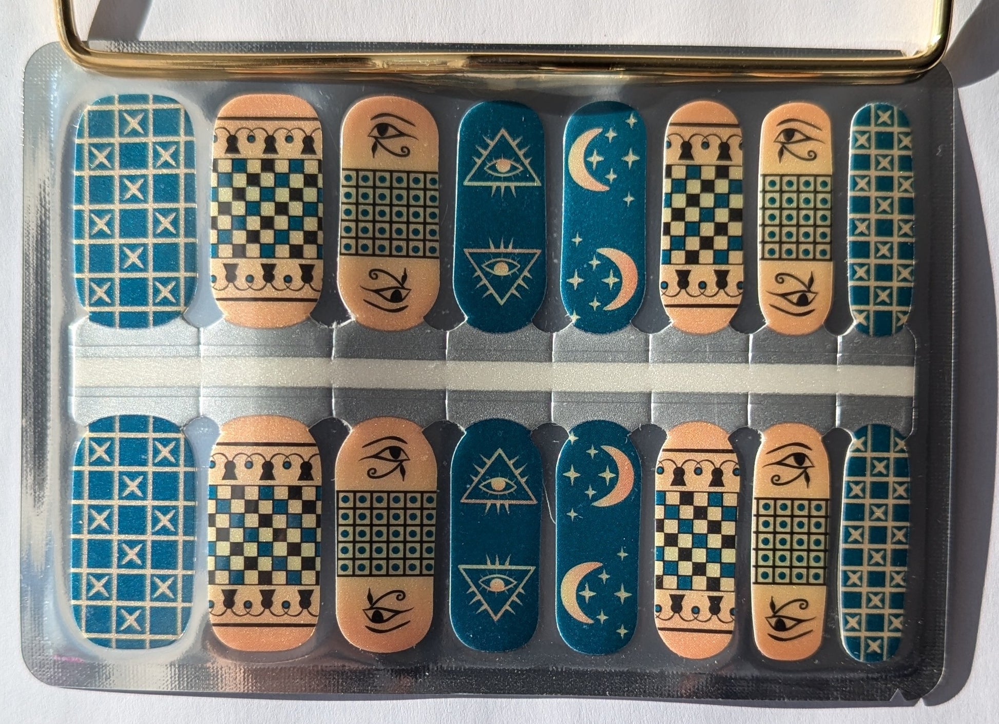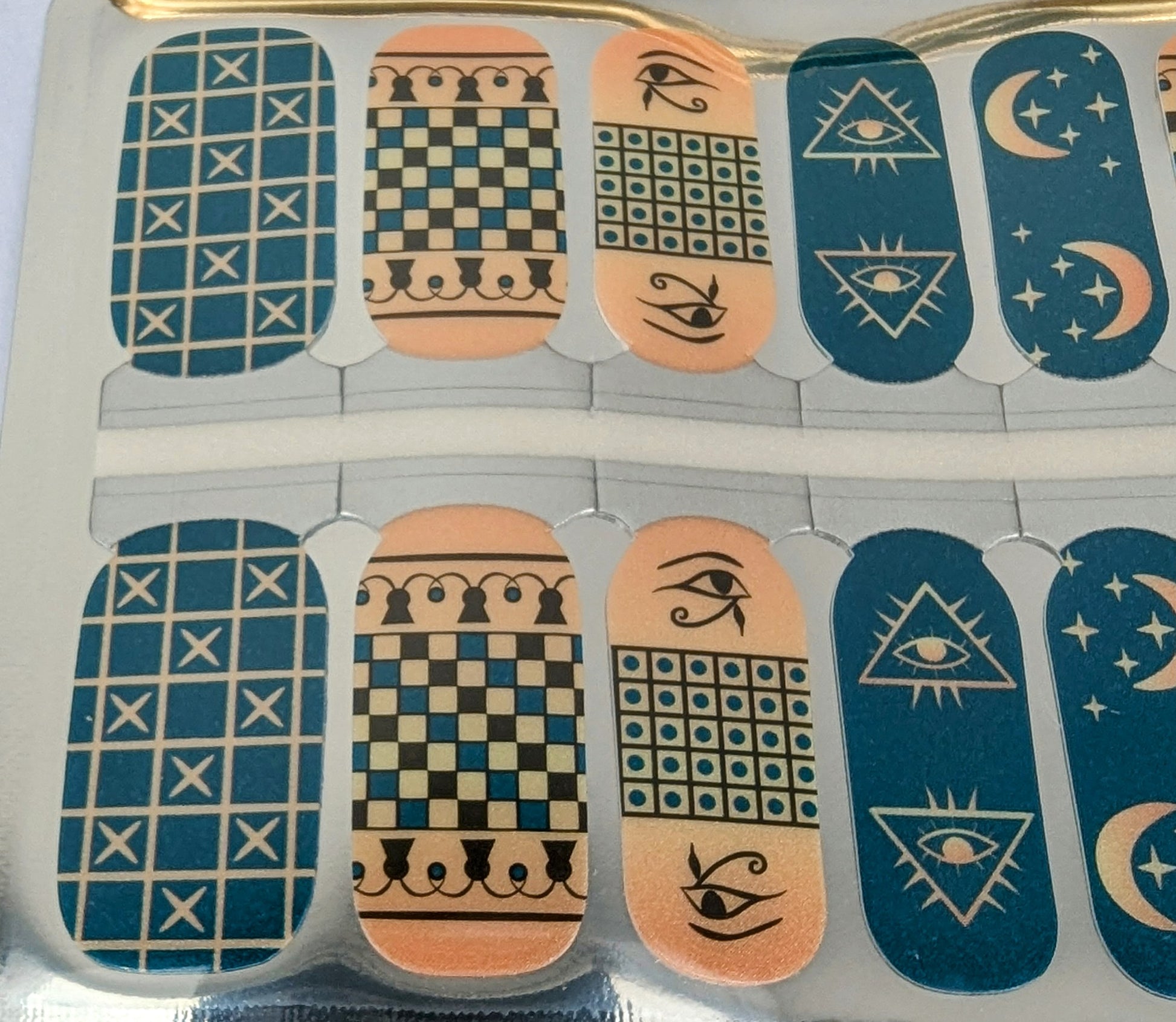 Get ready to shine with our Golden Nile nail wraps. These pearlescent nail wraps feature a luxurious combo of dark green and golden colors with metallic geometric patterns that add a touch of subtle elegance to your look. Perfect for any occasion, these wraps will make you feel glamorous in no time!