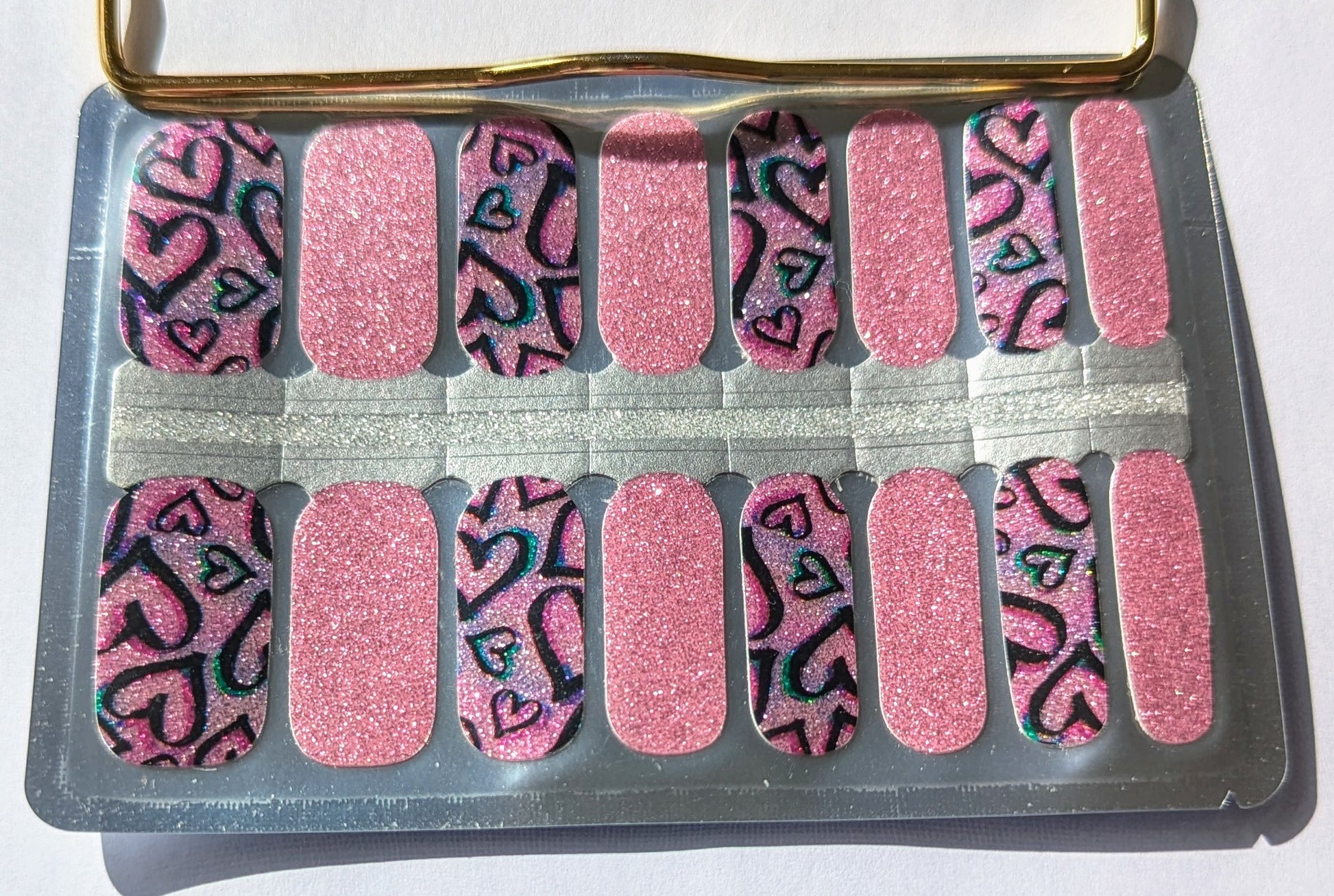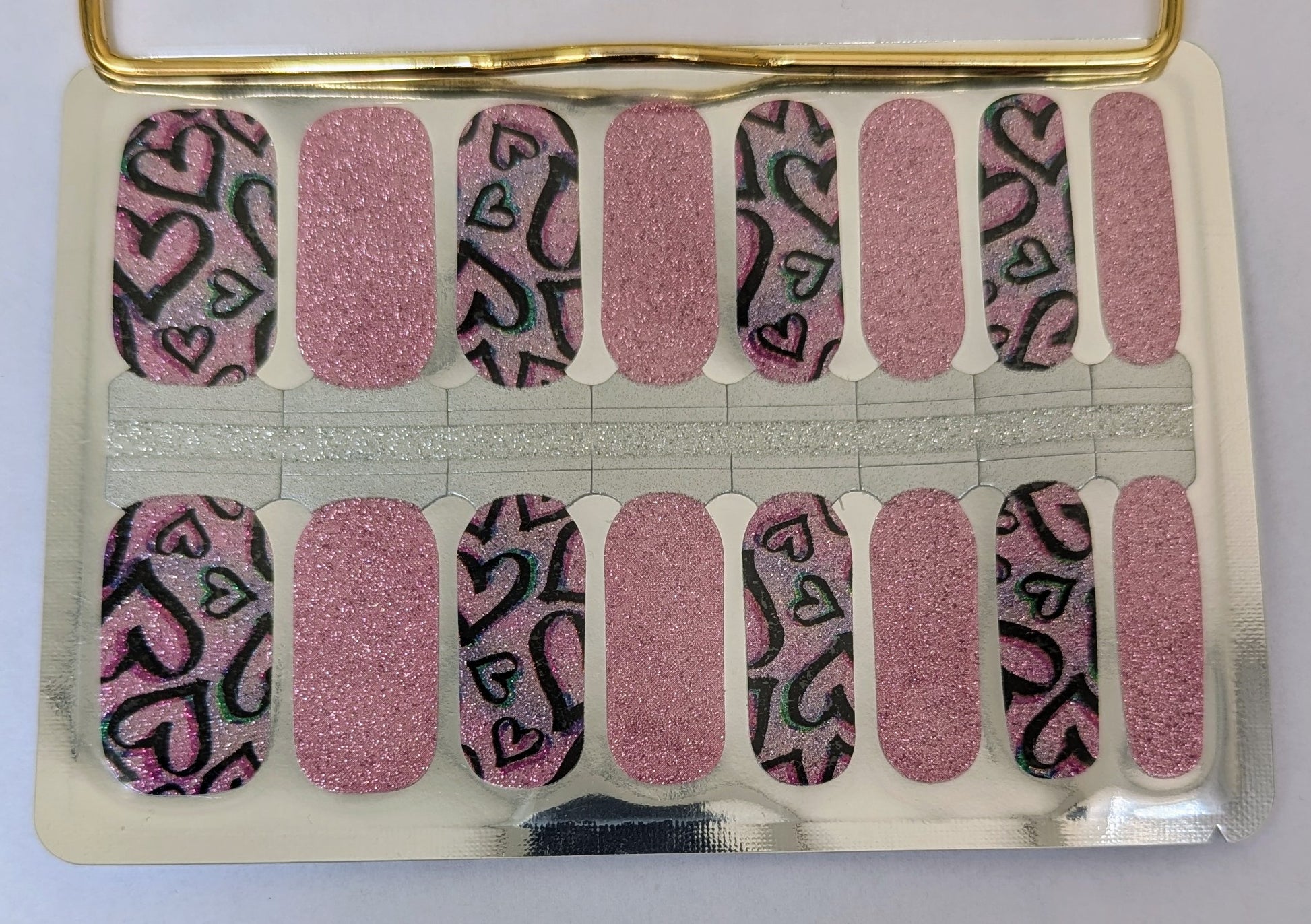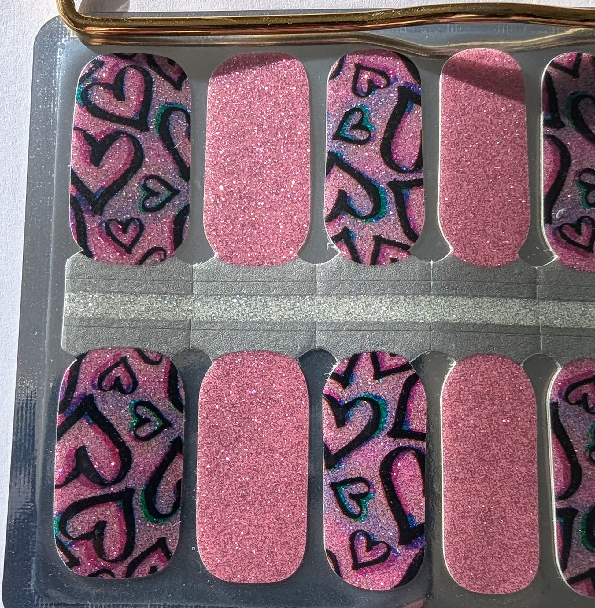Get ready to shine with our Graffiti Pulse nail wraps. These glittery nail wraps feature a combo of pink and black heart patterns that add extra style to your look. Perfect for any occasion, these wraps will make you feel glamorous in no time!