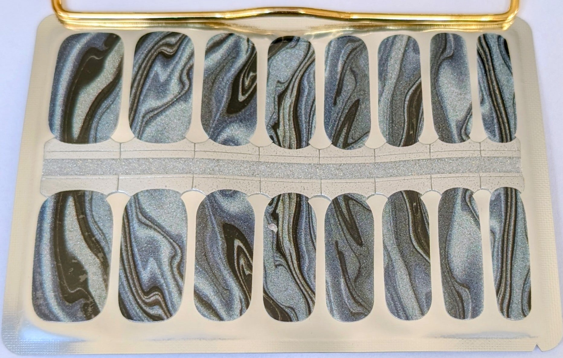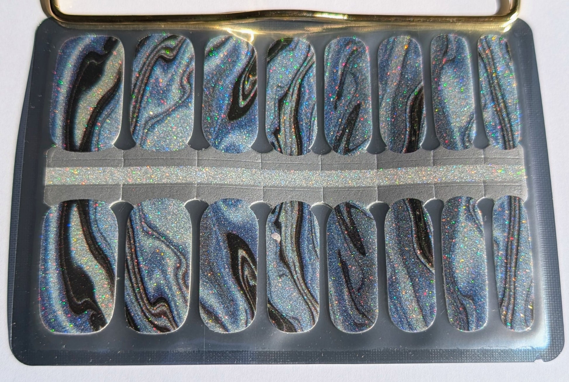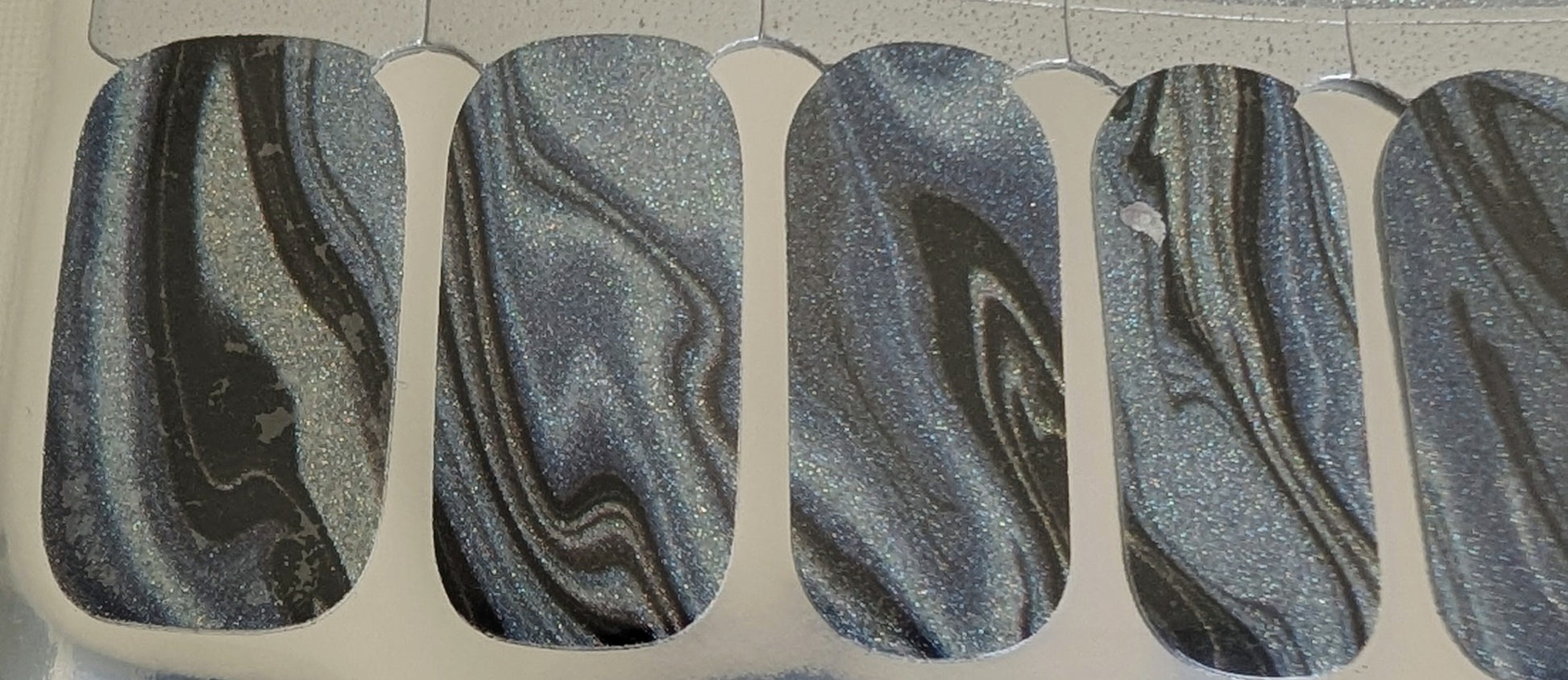 Bold, sleek, and perfectly futuristic, In Fine Orbit blends holographic sparkle with flowing black-and-silver marble swirls. The result is a multidimensional manicure that shifts beautifully in the light, giving your nails a cosmic, polished edge without feeling too loud.