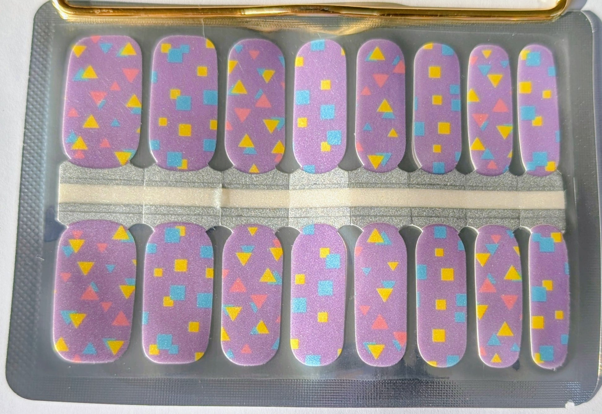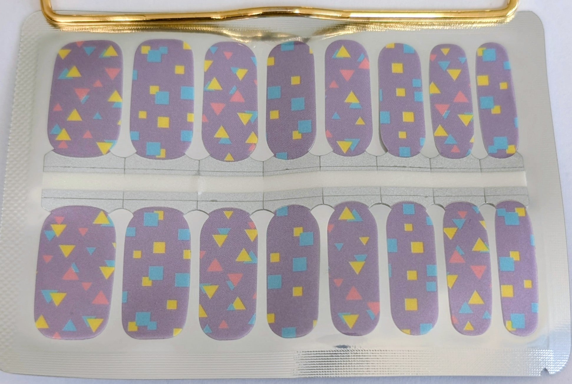 The subtle shimmer adds dimension without overpowering the design, while the mix of triangles, squares, and abstract forms keeps the look interesting and modern. It’s playful without being loud, polished without feeling boring.