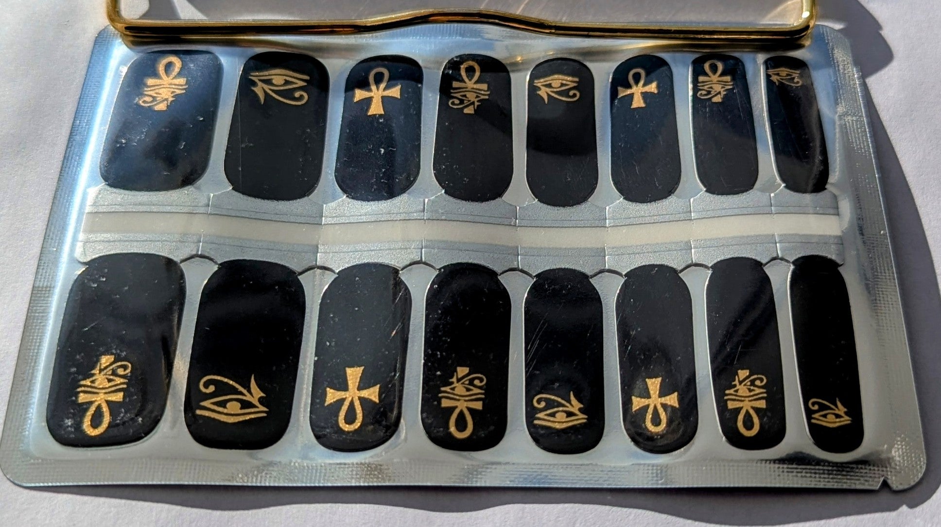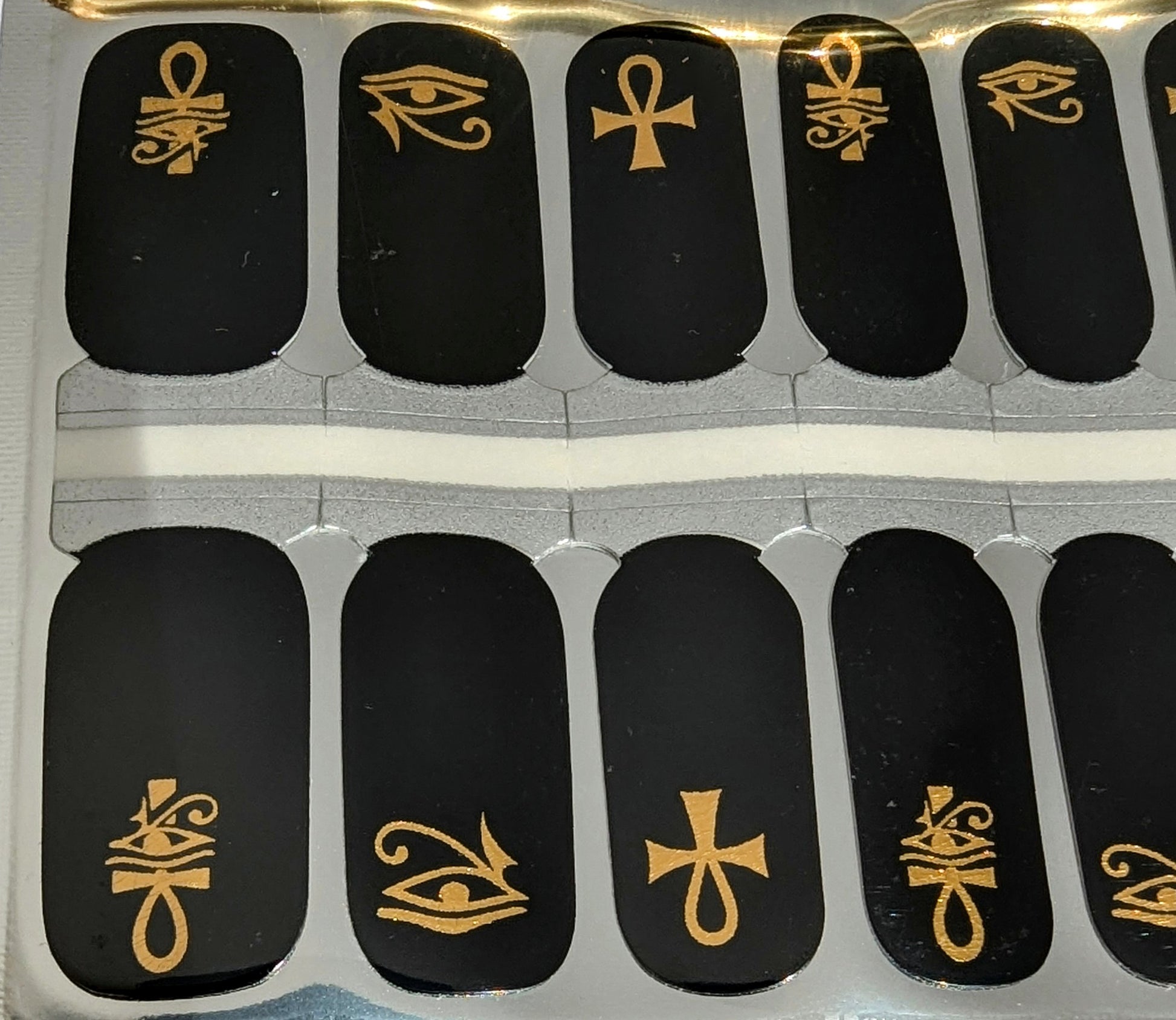 Get ready to shine with our Luxor Luxe nail wraps. These glossy nail wraps feature luxurious black and metallic golden hieroglyphs that add a touch of subtle elegance to your look. Perfect for any occasion, these wraps will make you feel glamorous in no time!