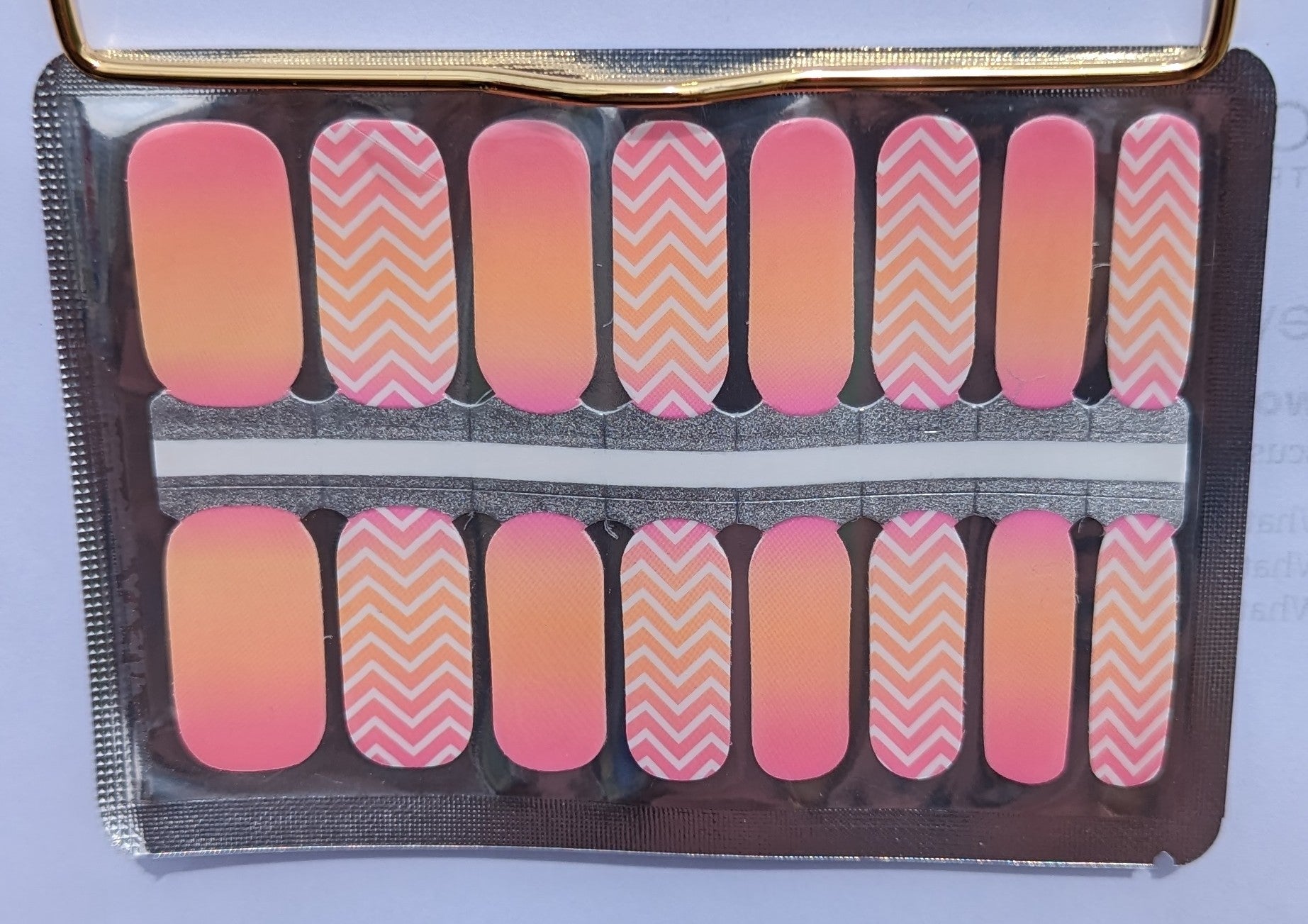 Get ready to shine with our Mango Rose Horizon nail wraps. These glossy nail wraps feature a summery rose pink to saffron mango ombré with a chevron pattern accent that adds a touch of elegance to your look. Perfect for any occasion, these wraps will have you feeling glamorous in no time!