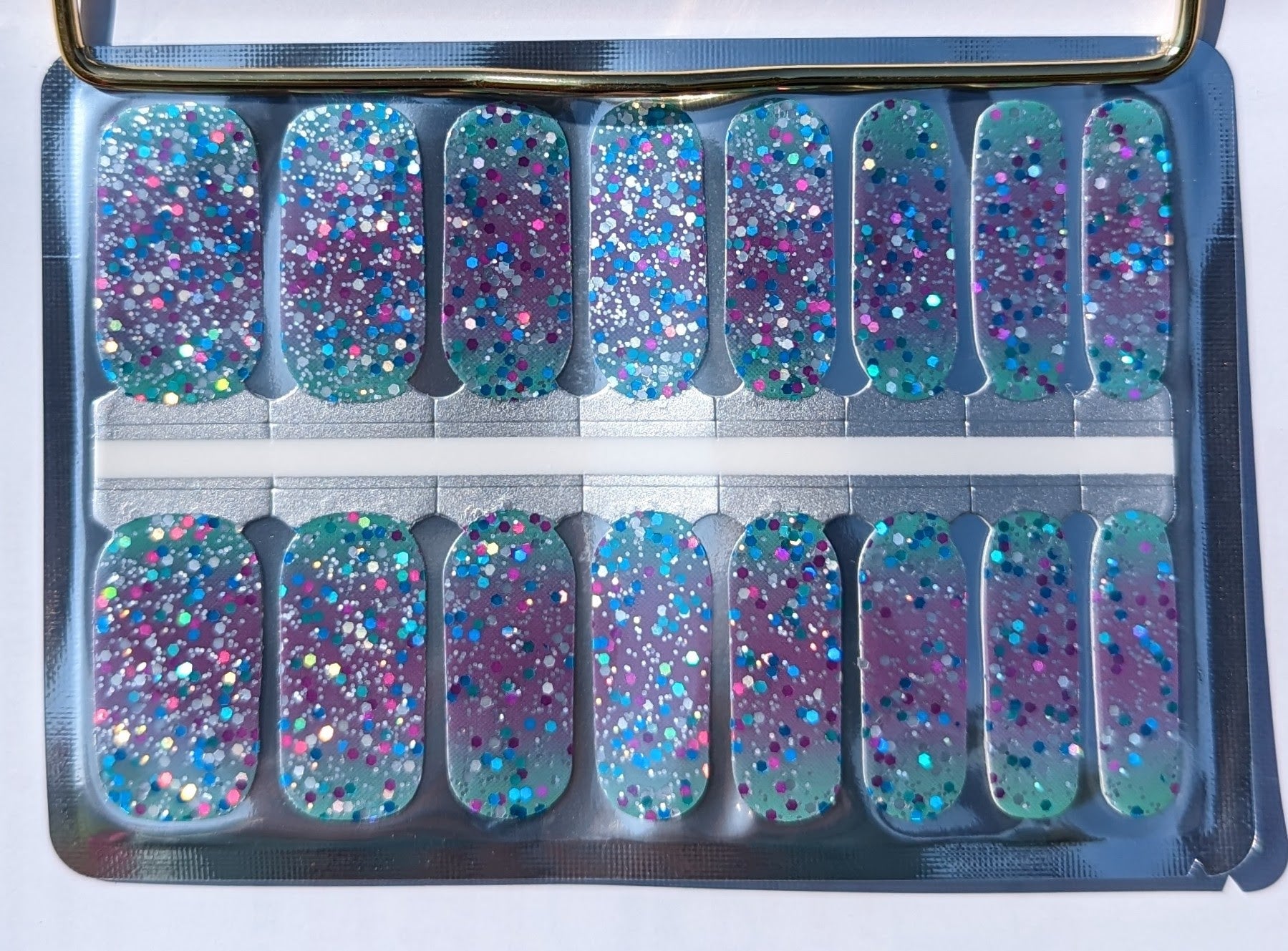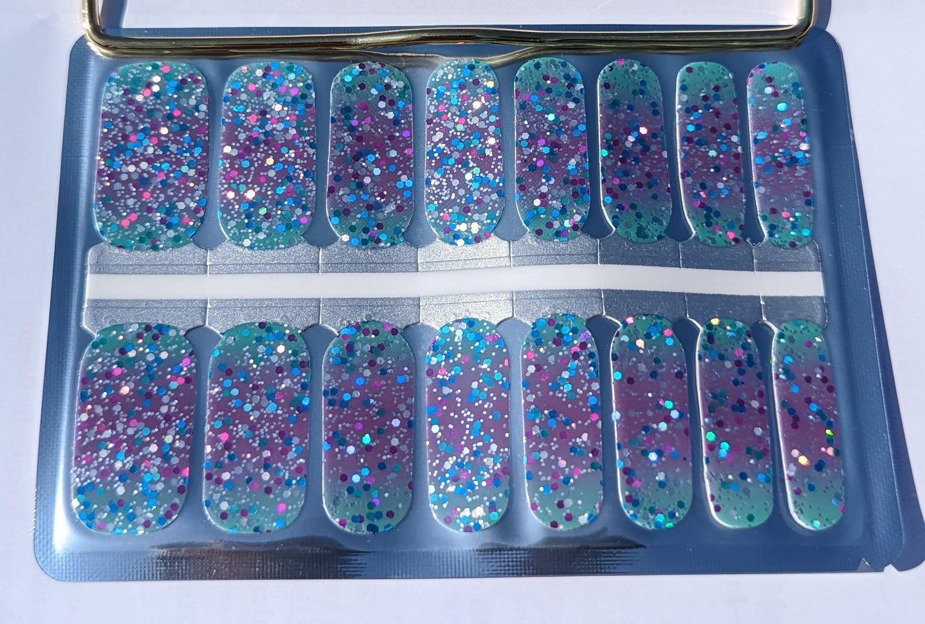 Get ready to shine with our Minty Purple Mirage nail wraps. These glittery nail wraps feature silver, green, and purple big glitters on a subtle ombré base that adds a touch of elegance to your look. Perfect for any occasion, these wraps will have you feeling glamorous in no time!