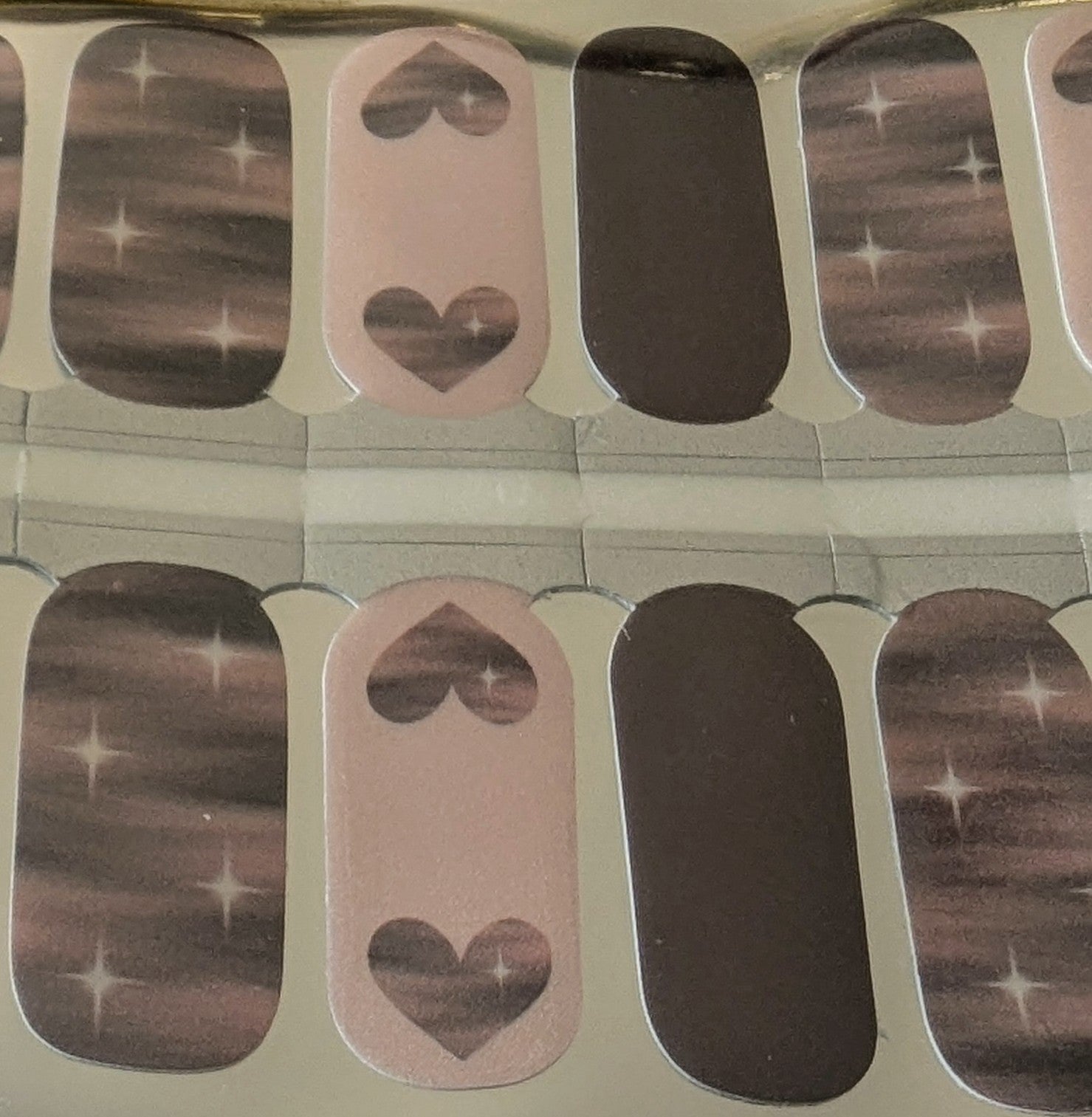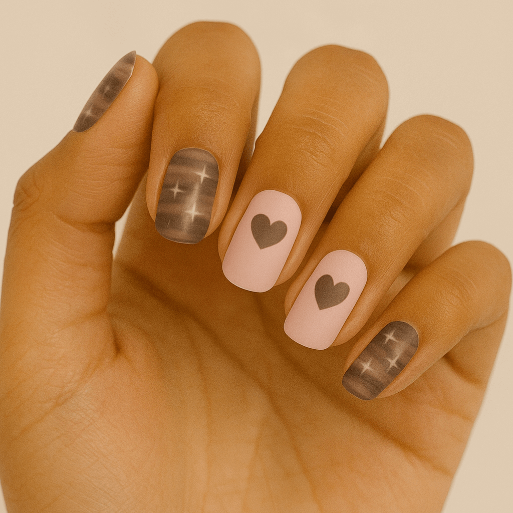 Fall for the rich elegance of Mocha & Cocoa. These pearlescent nail wraps feature soft brown tones with a shimmering mocha glow and a subtle heart cutout for a cozy finish. The deeper cocoa accent nails bring balance and warmth to this mixed mani, making it perfect for cooler months or neutral lovers who want a hint of shine.