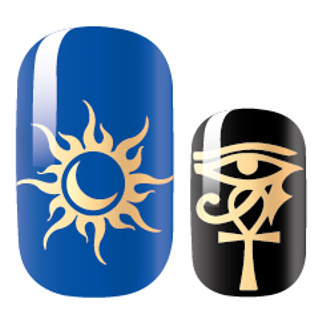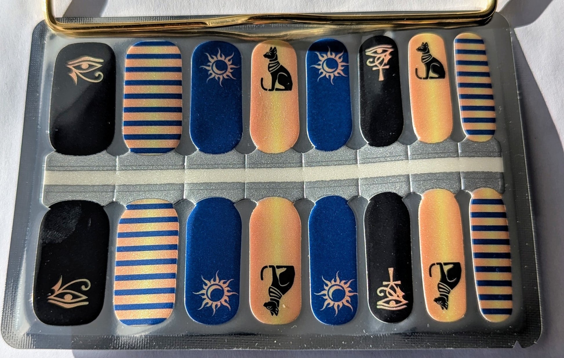 Get ready to shine with our Modern Hieroglyph nail wraps. These pearlescent nail wraps feature a luxurious black, blue, and golden combo with metallic hieroglyphs that add a touch of subtle elegance to your look. Perfect for any occasion, these wraps will make you feel glamorous in no time!