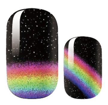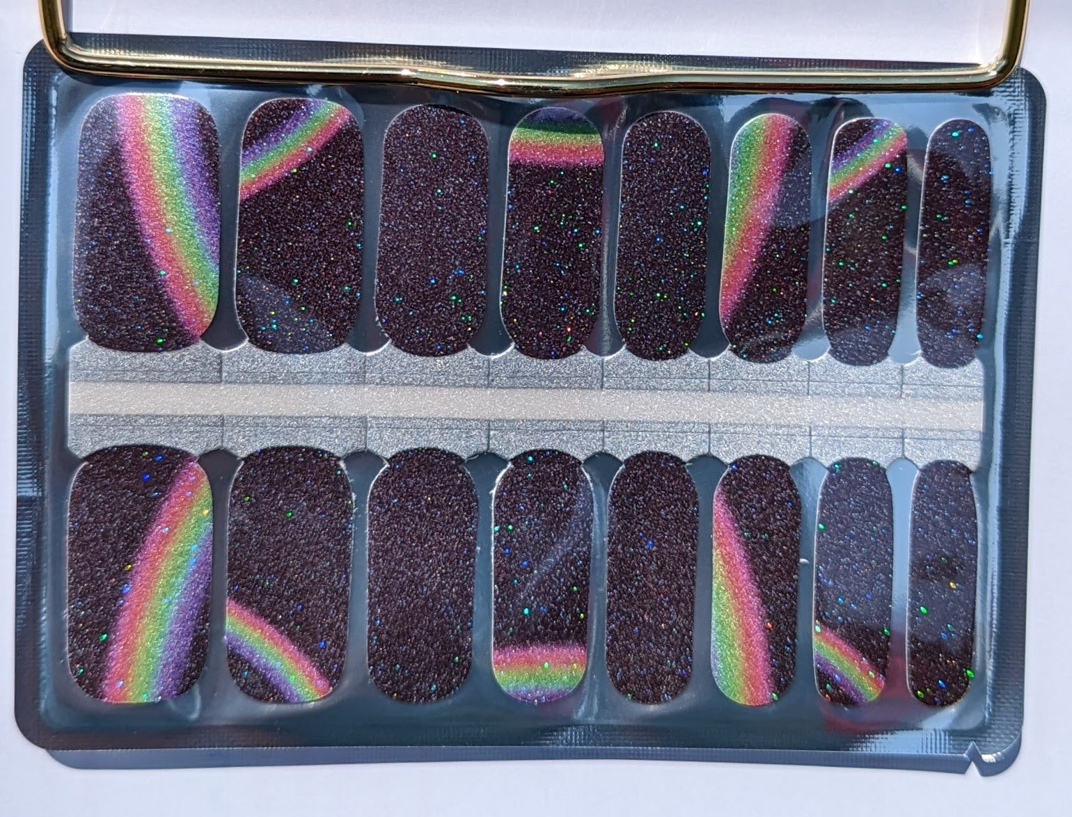 Get ready to shine with our Nocturnal Spectrum nail wraps. These glossy nail wraps feature a black shade with rainbow color patterns combined with subtle sparkles that add a touch of elegance to your look. Perfect for any occasion, these wraps will have you feeling glamorous in no time!