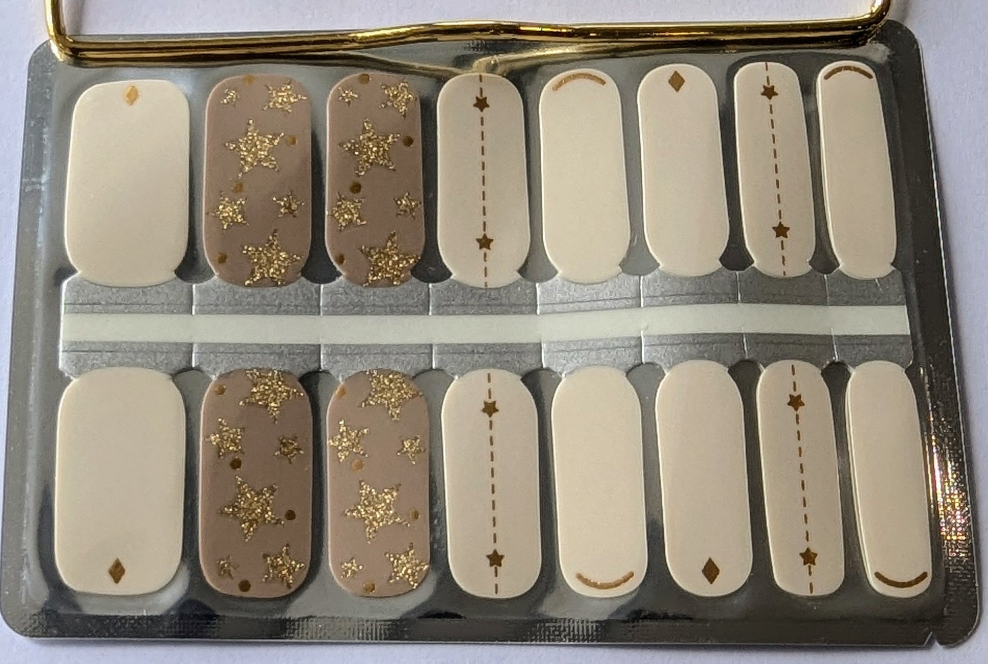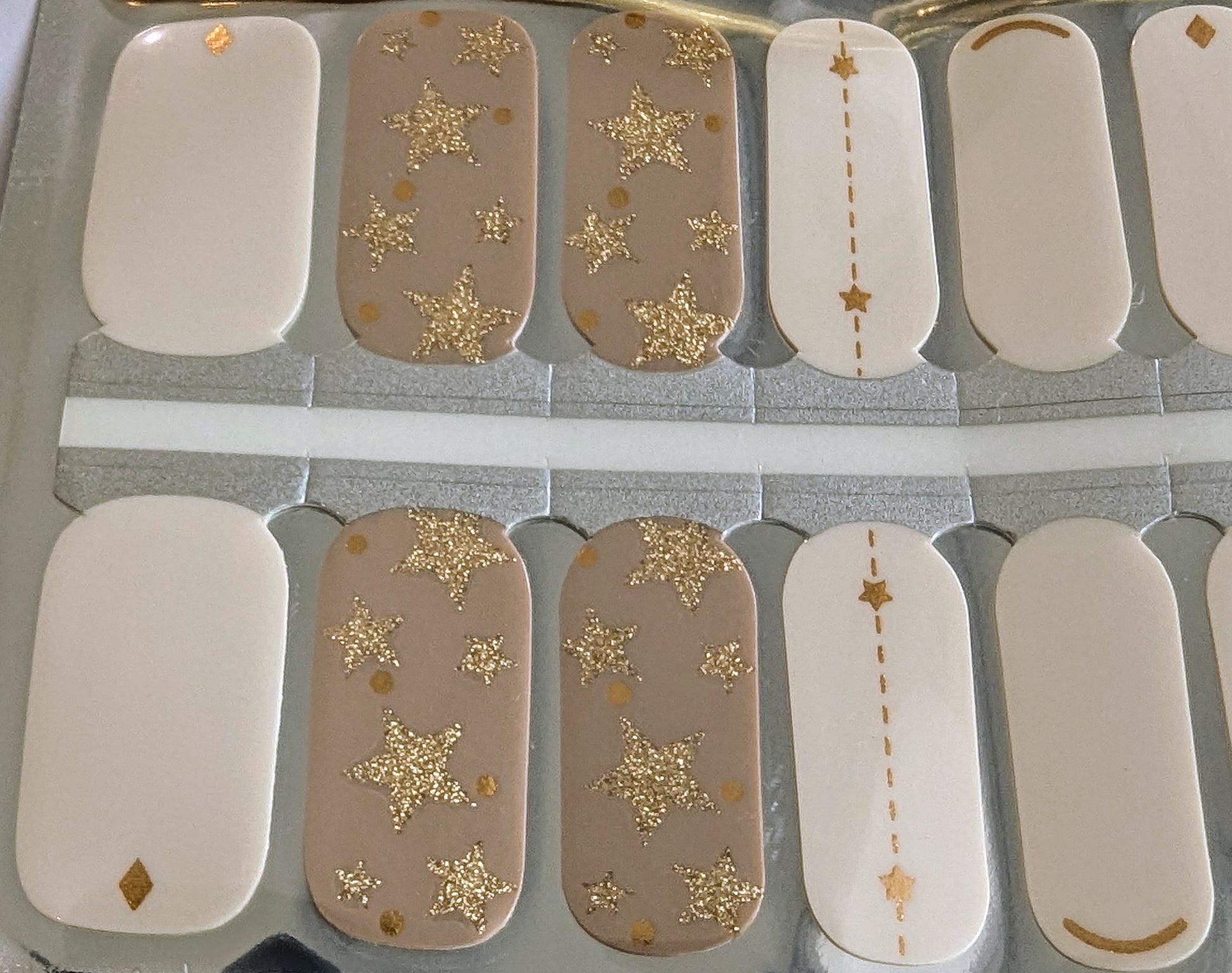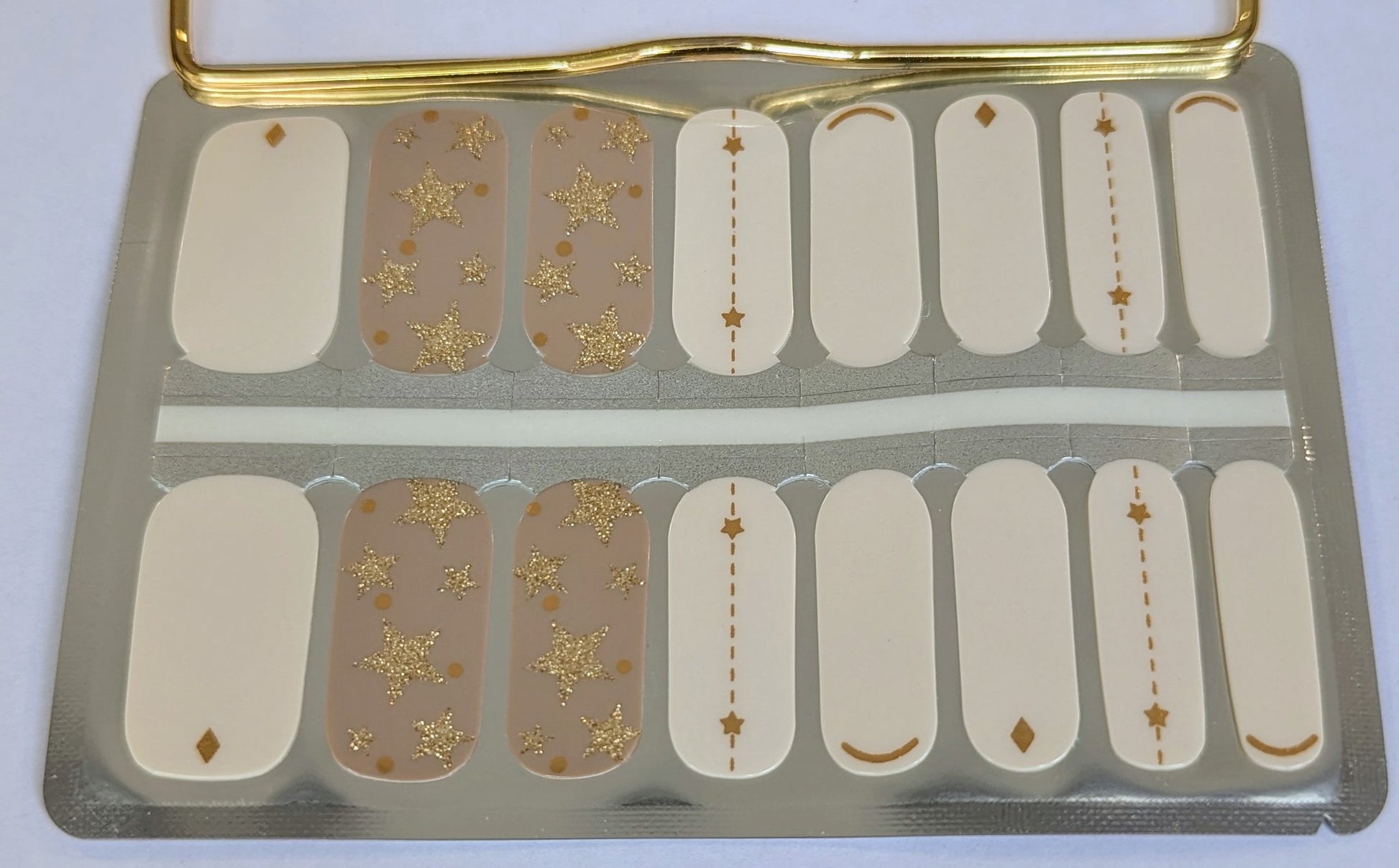 Minimalist base, maximum sparkle. Nude & Noted features a soft nude background with glittering gold stars and delicate metallic accents for a clean but standout mani. It’s the kind of design that feels polished and a little playful—perfect for parties, nights out, or just adding a little glow to your day.