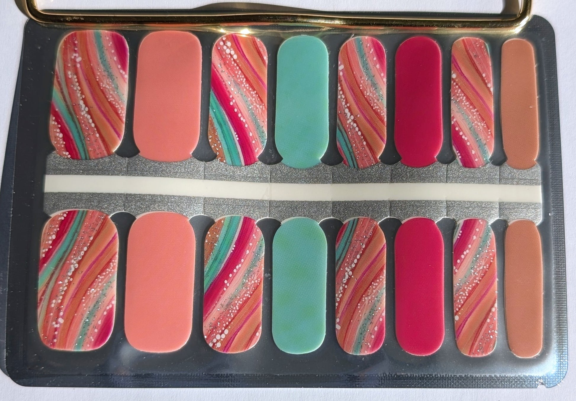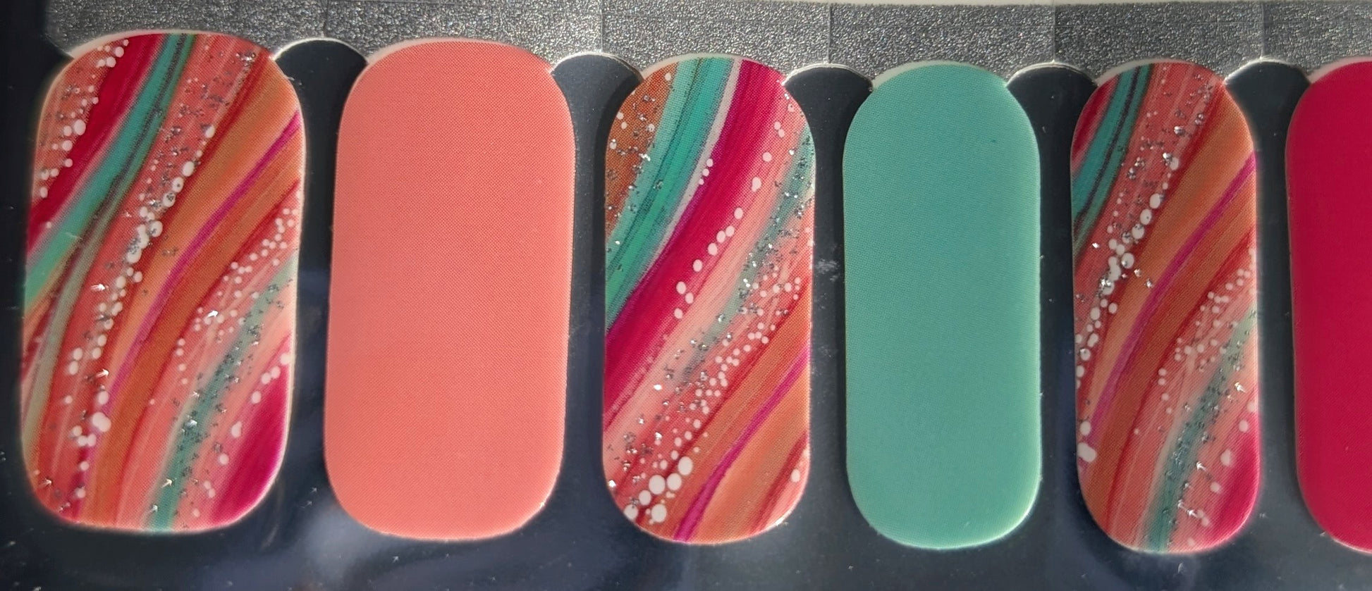 The mix of solid tones and shimmering curved designs creates a look that feels artistic without being overwhelming. It is playful, expressive, and surprisingly easy to wear. Perfect for anyone who loves color but still wants a polished, put-together finish.