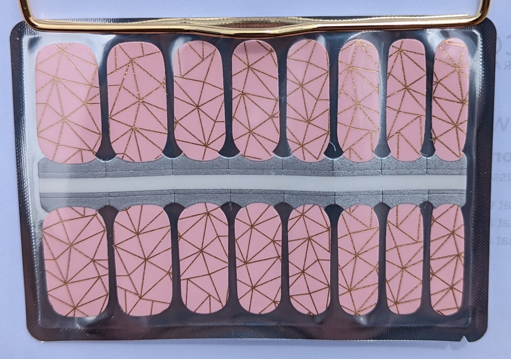Get ready to shine with our Pale Pink Glow nail wraps. These glossy nail wraps feature a sleek pale pink shade with subtle golden geometric patterns that add a touch of elegance to your look. Perfect for any occasion, these wraps will have you feeling glamorous in no time!