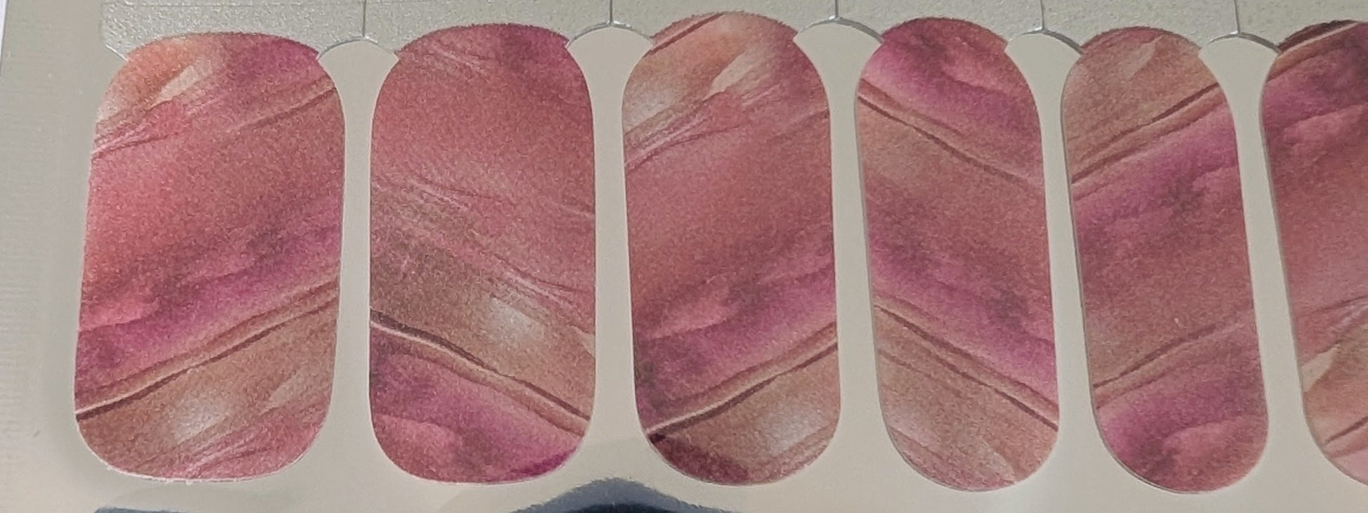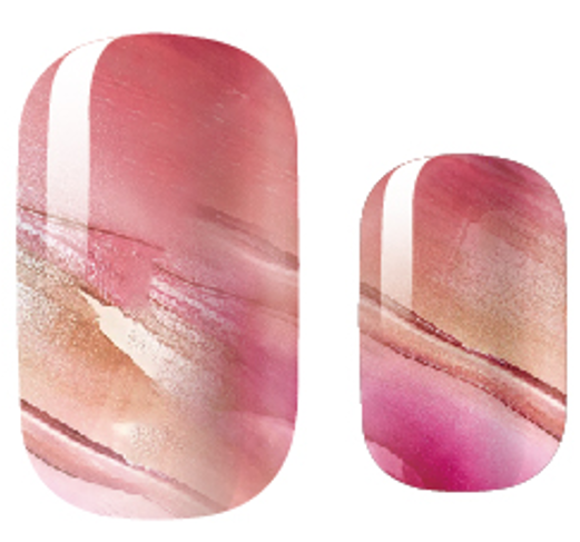 Soft, fluid, and quietly luminous. Rosé in Motion is a pearlescent nail wrap set featuring blended shades of rose, blush, and soft champagne tones, layered in a marbled, flowing pattern.