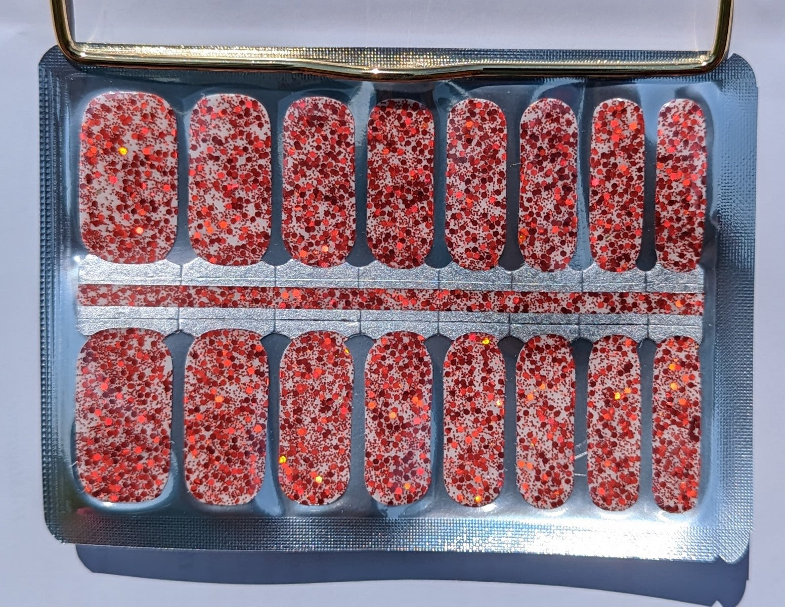 Get ready to shine with our Ruby Razzle nail wraps. These sparkly nail wraps feature various shades of vivid red big glitters that add a touch of elegance to your look. Perfect for any occasion, these wraps will have you feeling glamorous in no time!