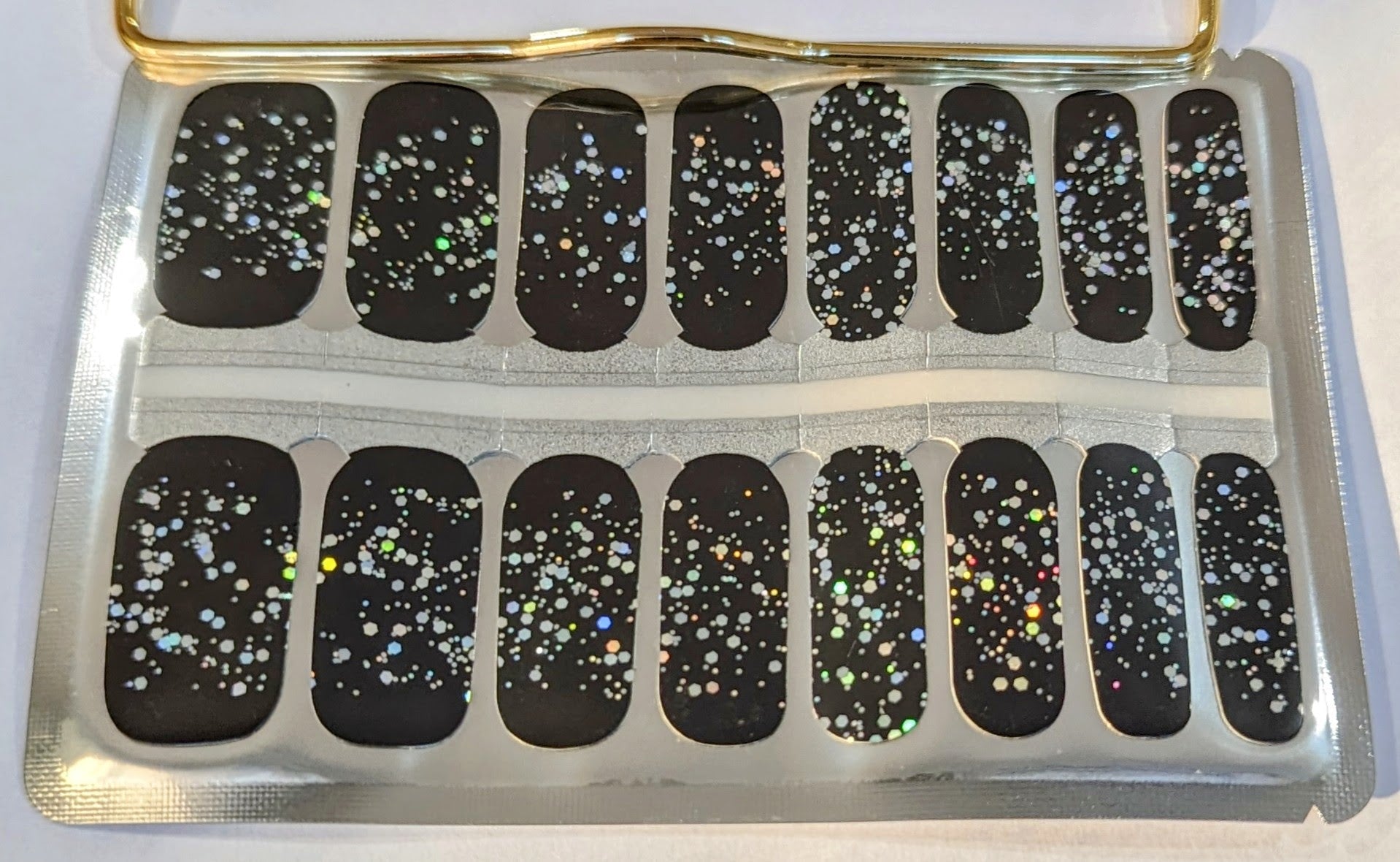 Get ready to shine with our Starlit Obsidian nail wraps. These glossy nail wraps feature a beautiful black color with silver big glitters that add a touch of festive elegance to your look. Perfect for any occasion, these wraps will have you feeling glamorous in no time!