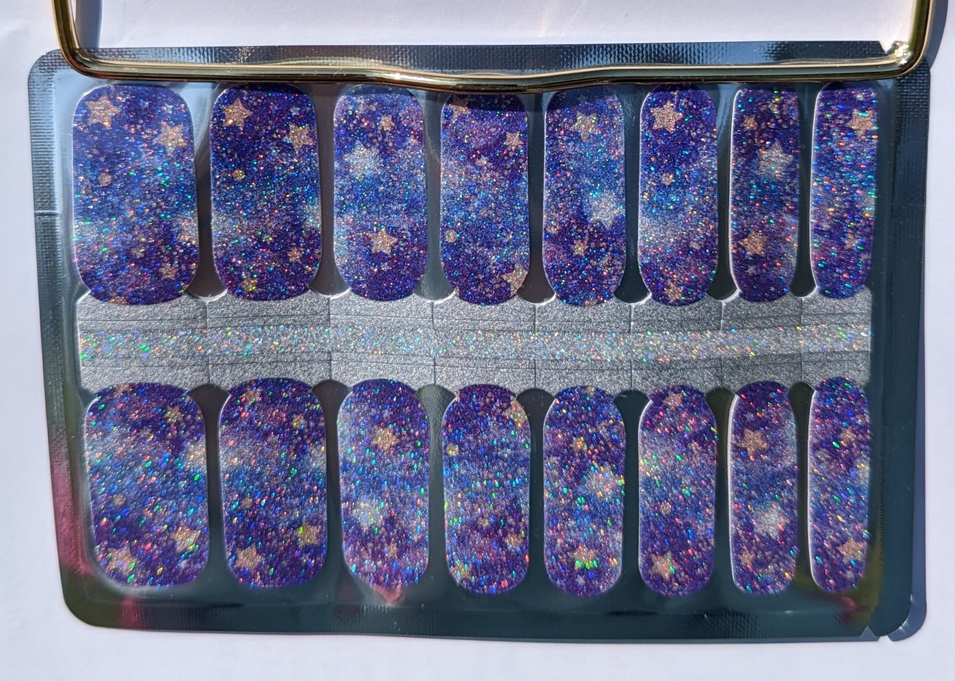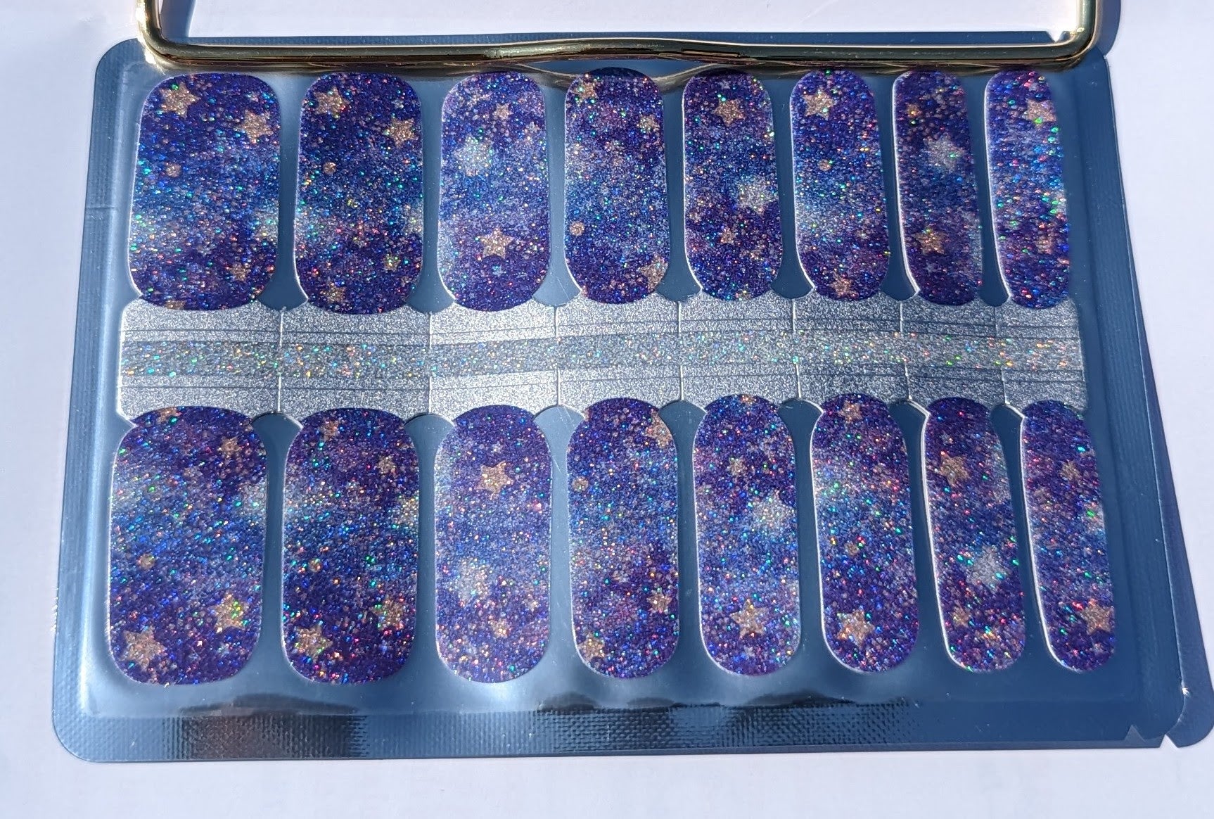 Get ready to shine with our Starry Sky nail wraps. These sparkly and glittery nail wraps feature a pretty combo of blue and purple shades with gold and silver stars that add a touch of elegance and cosmic vibe to your look. Perfect for any occasion, these wraps will have you feeling glamorous within minutes!