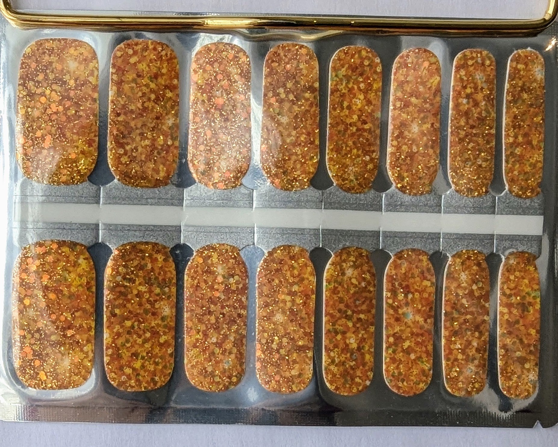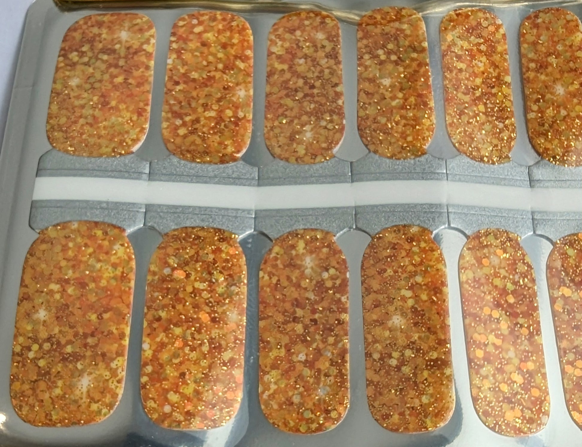Get ready to shine with our Sunlit Amber nail wraps. These glittery nail wraps feature a mix of sunny yellow, light amber, and light orange with golden glitters that remind of the fall season and add a touch of elegance to your look. Perfect for any occasion, these wraps will make you feel glamorous in no time!
