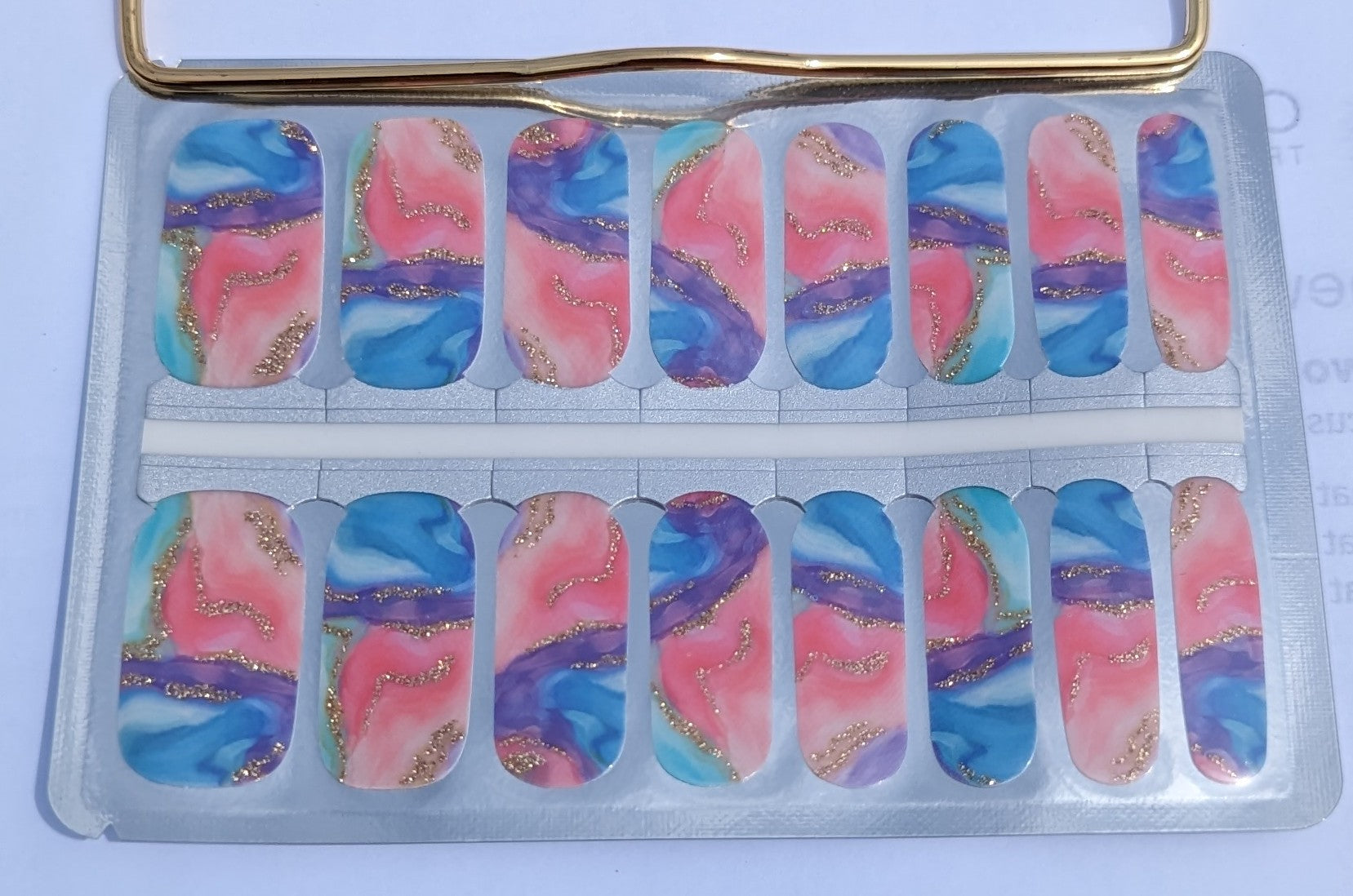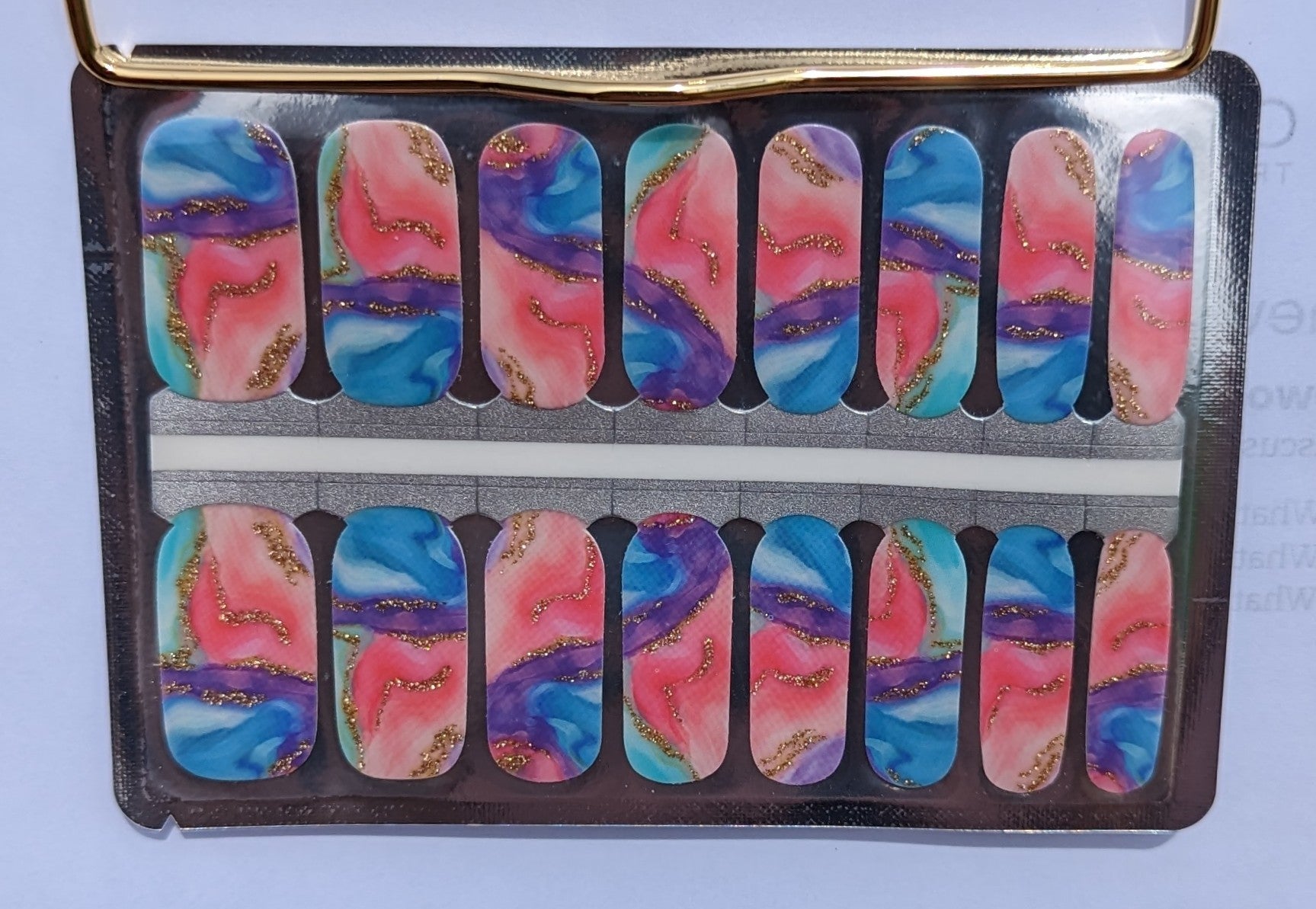 Get ready to shine with our Swirling Shades nail wraps. These glossy nail wraps feature a pretty multicolor combo with a marbled effect that adds a touch of elegance to your look. Perfect for any occasion, these wraps will have you feeling glamorous in no time!