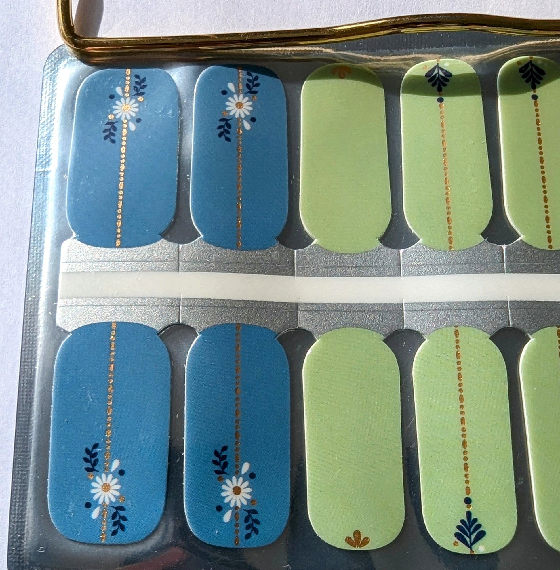 Get ready to shine with our Tidal Garden nail wraps. These sleek and glossy nail wraps feature various tones of blue and green shades with golden metallic streaks and flowers that add a touch of subtle elegance to your look. Perfect for any occasion, these wraps will have you feeling glamorous in no time!