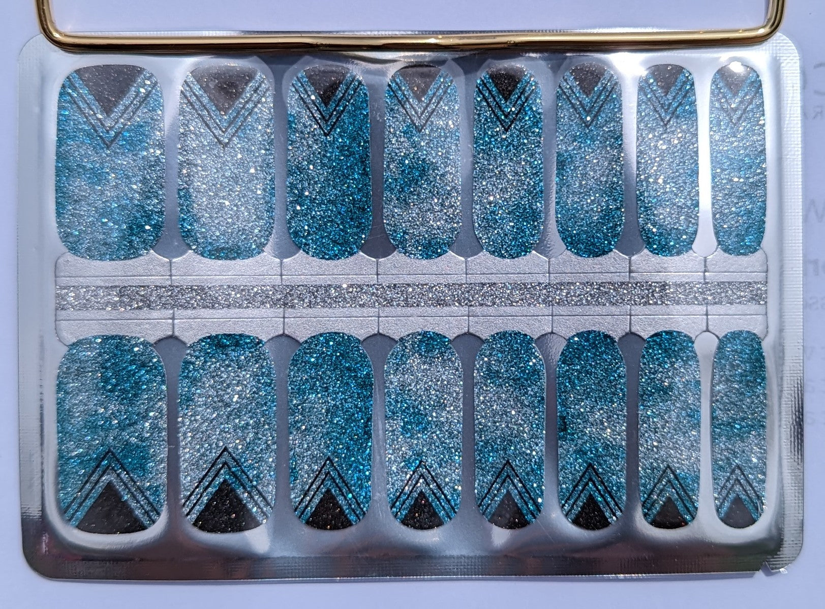 Get ready to shine with our Triangle Overlap nail wraps. These sleek nail wraps feature a light blue marbled color in a glittery finish with striking black triangles that add a touch of elegance to your look. Perfect for any occasion, these wraps will have you feeling glamorous in no time!