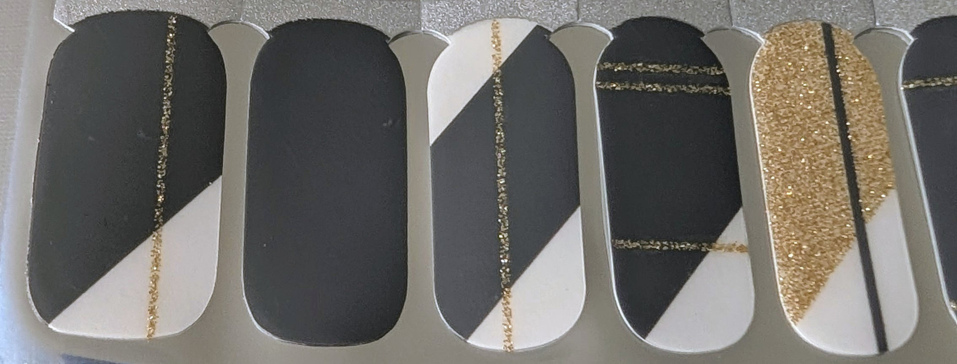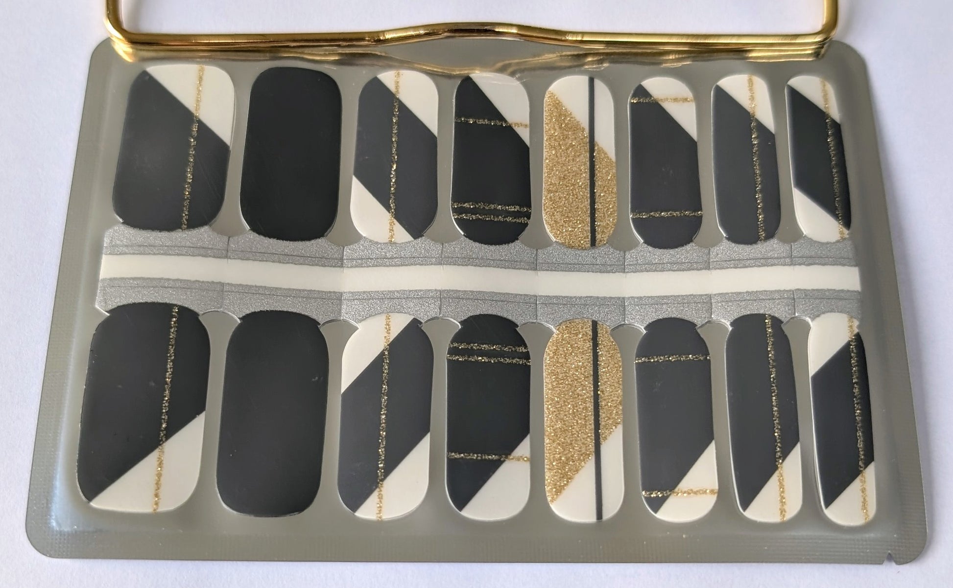 Sophisticated with a modern edge. Urban Contrast combines dark grey tones, transparent sections, and fine gold glitter lines in a glossy finish. The result is a polished, architectural look that feels both bold and refined, perfect for anyone who loves understated glamour with a city-chic twist.